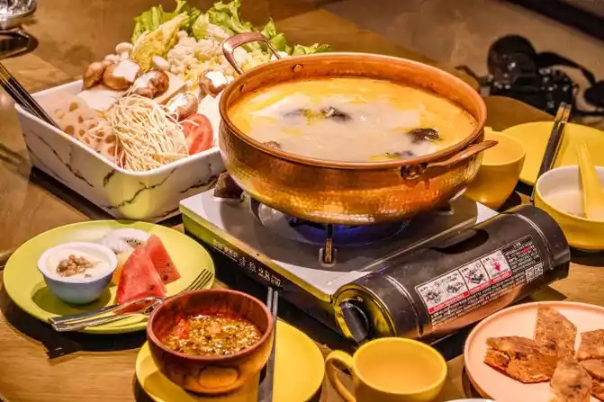 yak bone soup with chili dipping sauce, supplemented by Tibetan fragrant pork and free-range chicken, made copper pot soup and stone pot soup, nourishing the stomach and satisfying.