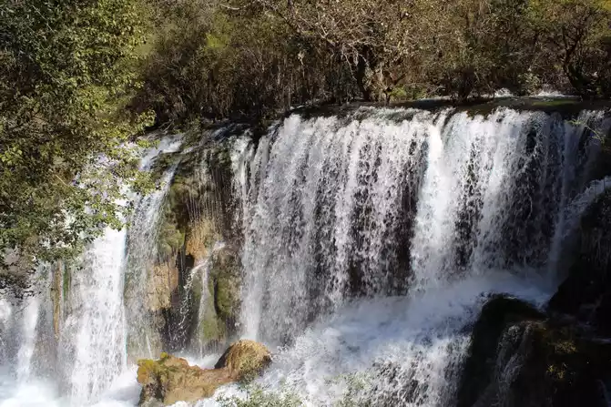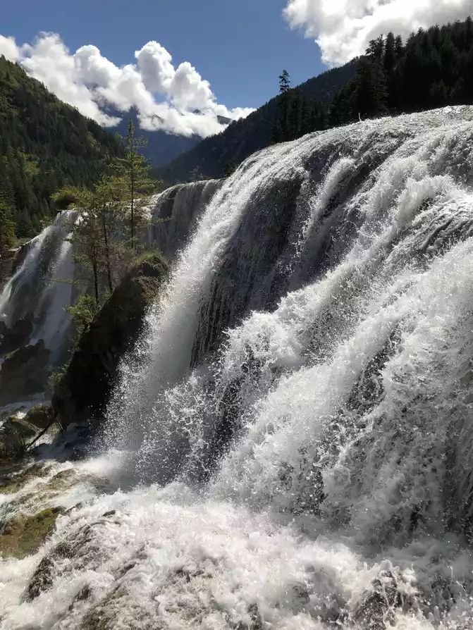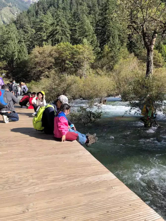 Today, there are about 7,000 people entering the ditch, basically no need to wait for the car, just get on the car and go, the scenic spot is Y-shaped two lines, generally directly take the car to the end and then play down, and then take the car to another line at the Nuorilang Waterfall transfer station, we take another line from Wuhuahai ~ Pearl Beach Waterfall ~ Nuorilang Waterfall, take another line to Changhai ~ Wucai Pond ~ Shuzheng Waterfall ~ Panjing Beach, take Xiaoqing to a station to take the car, take a shallow road, walk about 3 kilometers, tired enough, Xiaoqing followed to play, climb trees, play in the water, drink butter tea, and watch the waterfall Finally, at 4:30 p.m., I took a look at my favorite attractions in Jiuzhaigou.