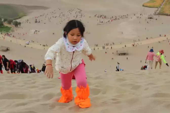 My daughter and girlfriends went to climb the sand mountain, we took the sisters to play in the sand in the crescent spring, the sister said that she wanted to climb the sand mountain to find her mother, grandpa said yes, the young lady herself was like an arrow rushing up the mountain, she didn't follow the team, she climbed quickly next to her, grandpa chased, and in the blink of an eye, she had climbed to a height of 2/3, which was great, and my sister also wanted to go up, oh my God, just think about it. When my sister came down, she also created her own butt sandboarding method, which was completed in about 40 minutes, and Mommy and her girlfriends were still halfway down the mountain.
