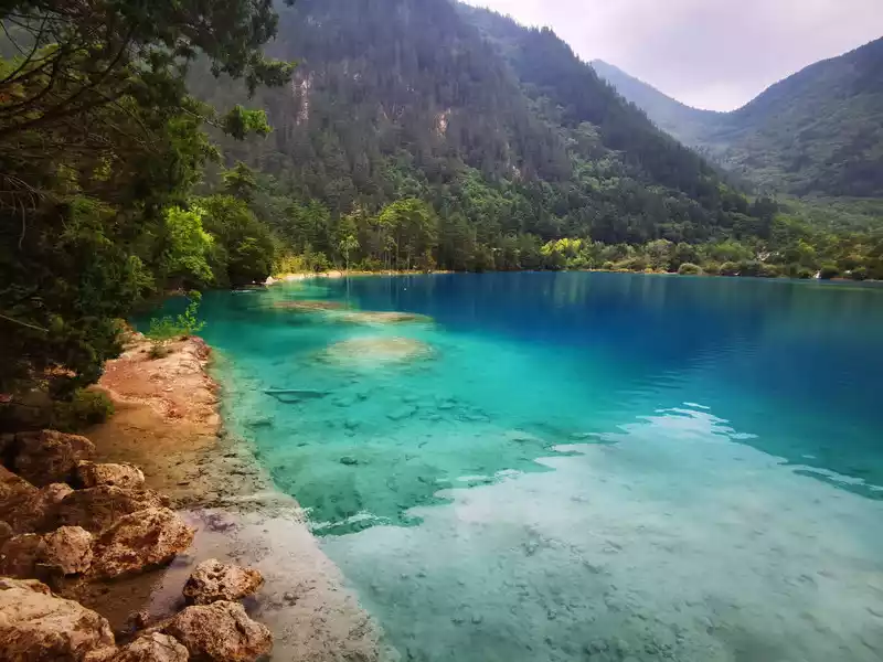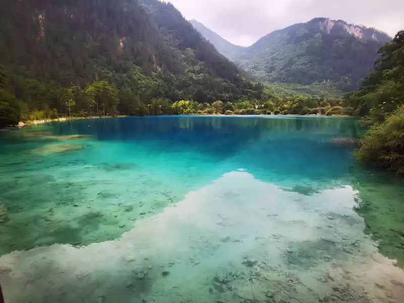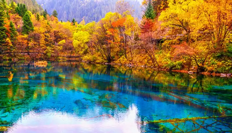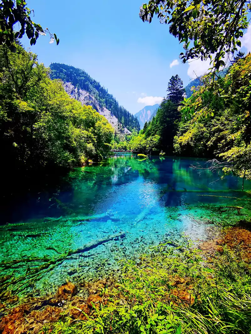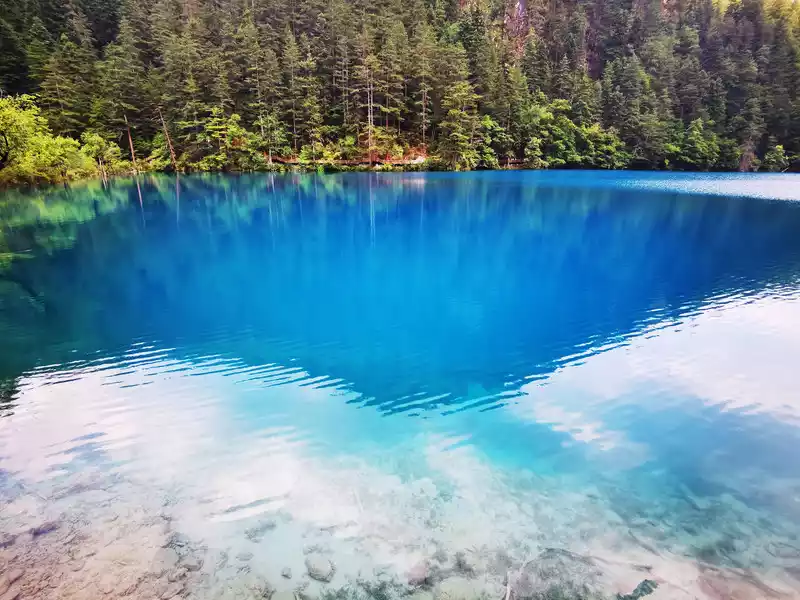 Coming down from the Panda Sea, reaching the most famous Wuhua Sea in Jiuzhaigou, with an altitude of 2,472 meters and a depth of 5 meters, it is the most wonderful attraction among all the attractions in Jiuzhaigou, known as the "essence of Jiuzhai"; The Five Flowers Sea is colorful due to the travertine deposits on the seabed, various colors of algae and the reflection of colorful trees on the shore, which is beautiful at any shot, but it is also a place where tourists gather.
