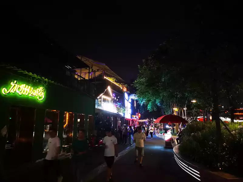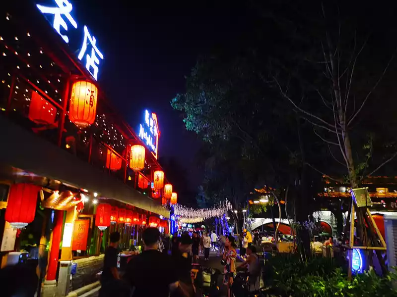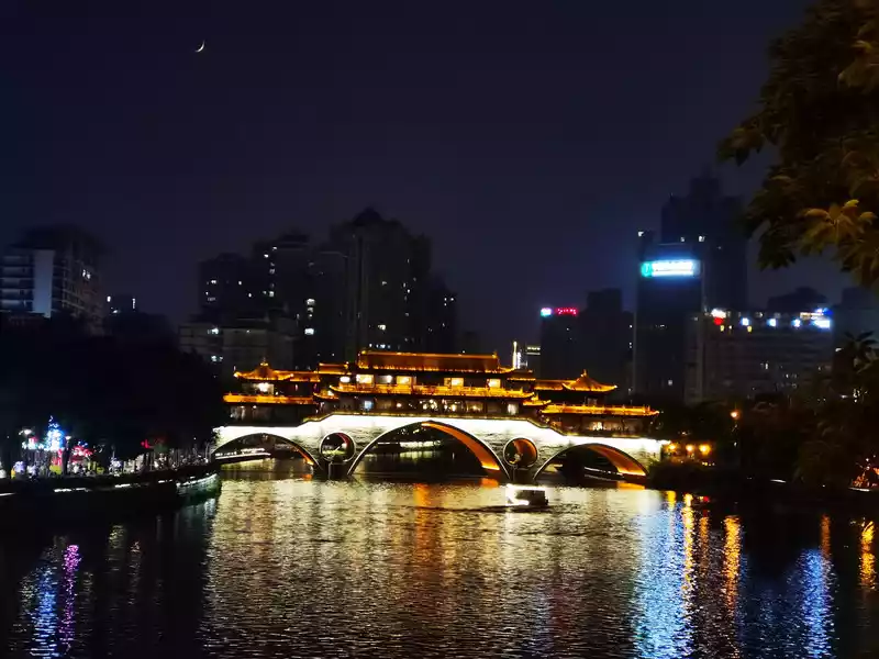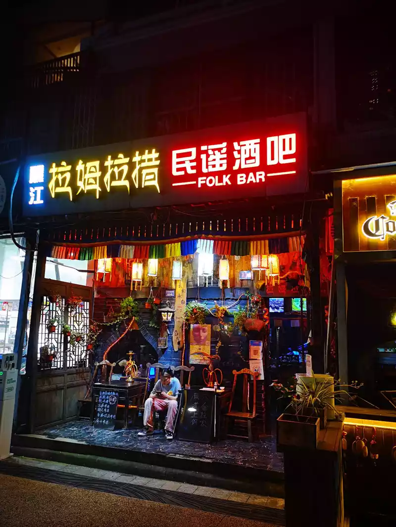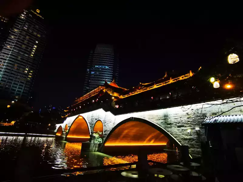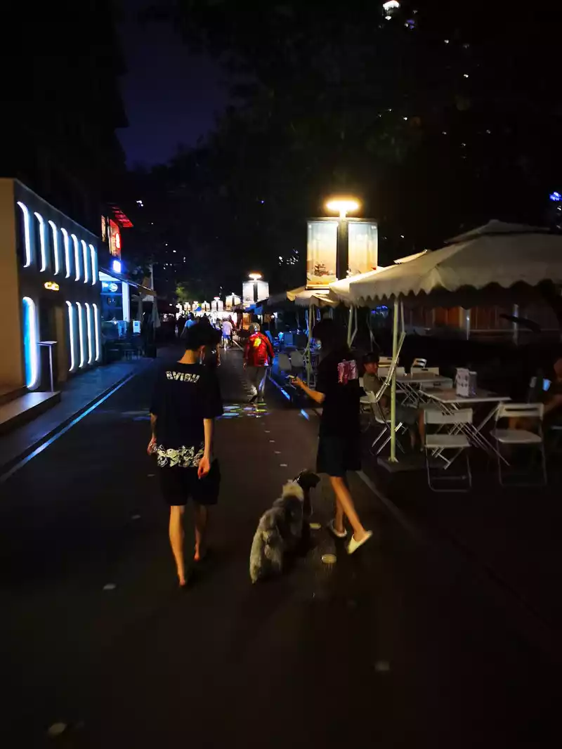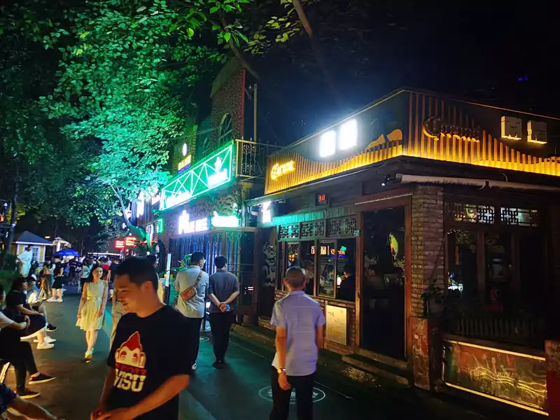 After the meal, stroll all the way to Taikoo Li, there is a very famous naked-eye 3D, we also came to join in the fun, although the time is not long, but the picture is still good, Brother Qi likes it very much. I saw the night view on Chunxi Road, but I didn't choose to enter the mall, I took a taxi to Jiuyanqiao to see the bar street in Chengdu, I really saw it, because we didn't enter the bar at all, haha. Jiuyanqiao Bar Street is located on the banks of the Minjiang River, and at night, it is also good to drink a little wine by the river and listen to songs.