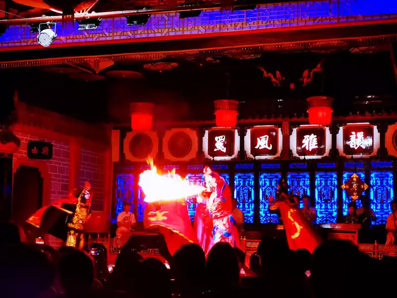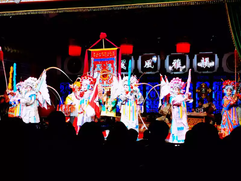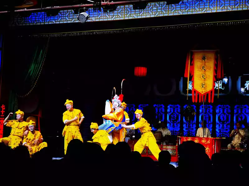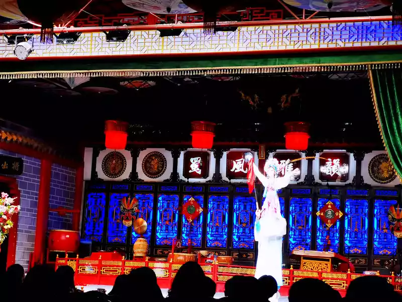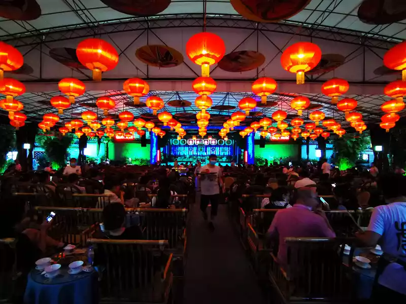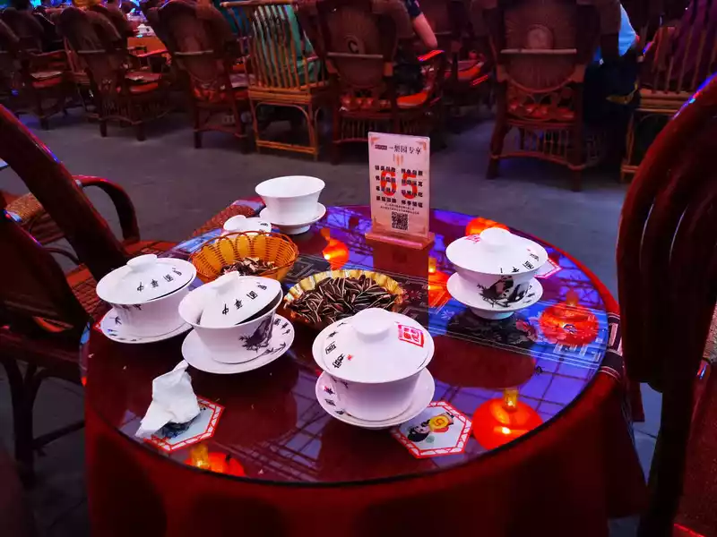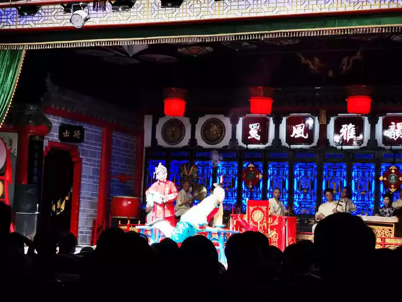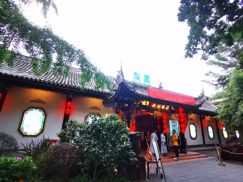 third stop is Shu Feng Yayun, Shu Feng Yayun Sichuan Theater is located in the Municipal Cultural Park, there is a large pond of lotus flowers in the park, come early, you can take pictures of the lotus flowers, watch the square dance, Drink some tea again, and it's quite good.Shu style elegant rhyme, traditional pear garden stage, semi-open, bamboo chairs, cattail fans, eating melon seeds, gaiwan tea, listening to Sichuan opera, erhu suona, looking at the puppet hand shadow play, the classic clown drama is amazing, the finale changes faces to ignite the audience, the audience laughs, applause, the interaction is very good, very worthwhile.