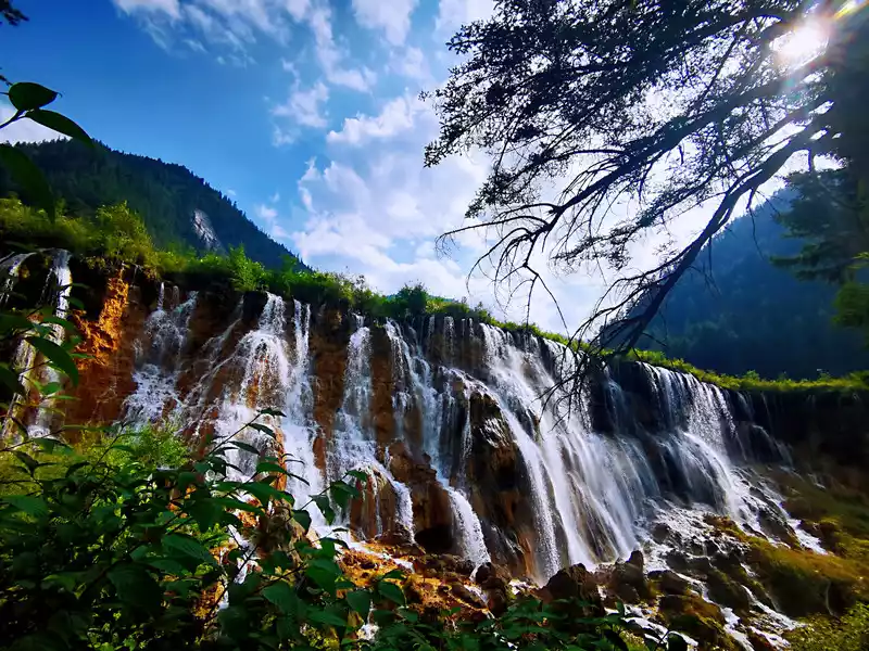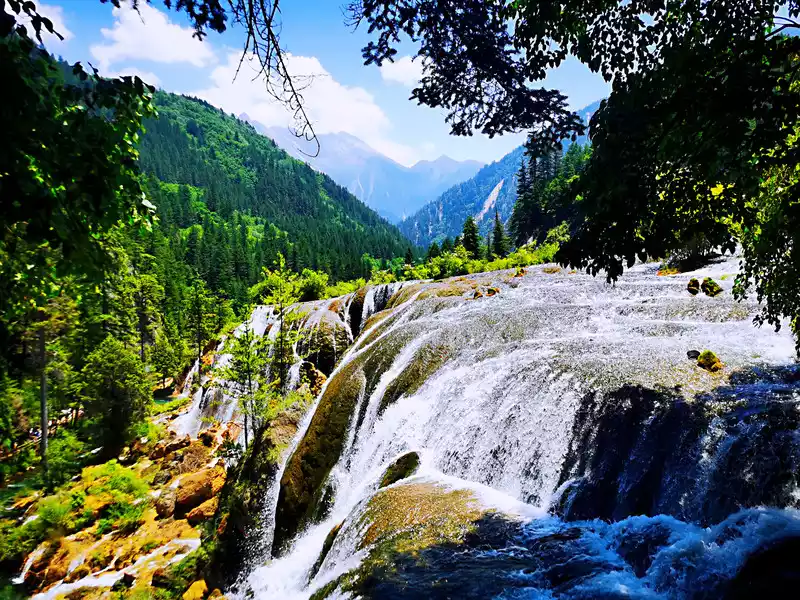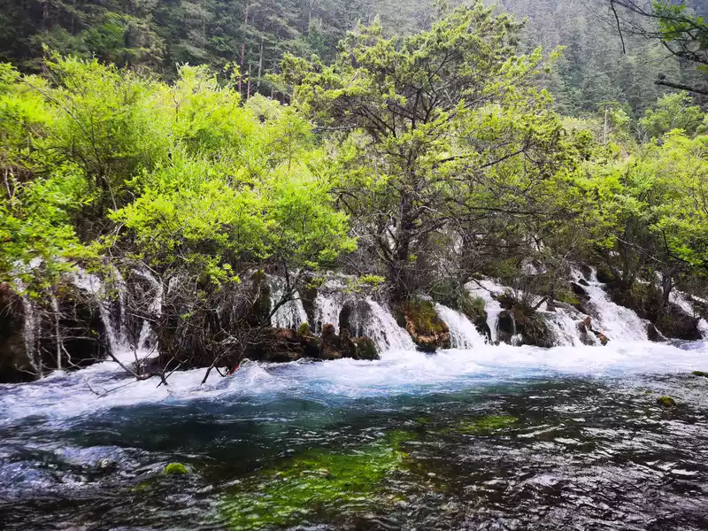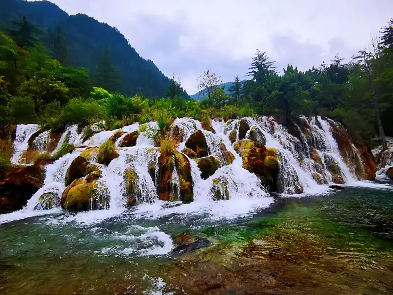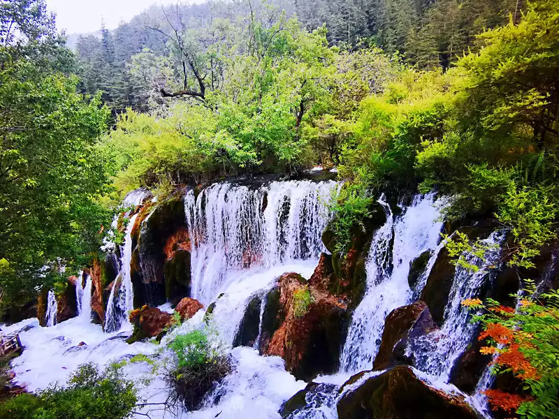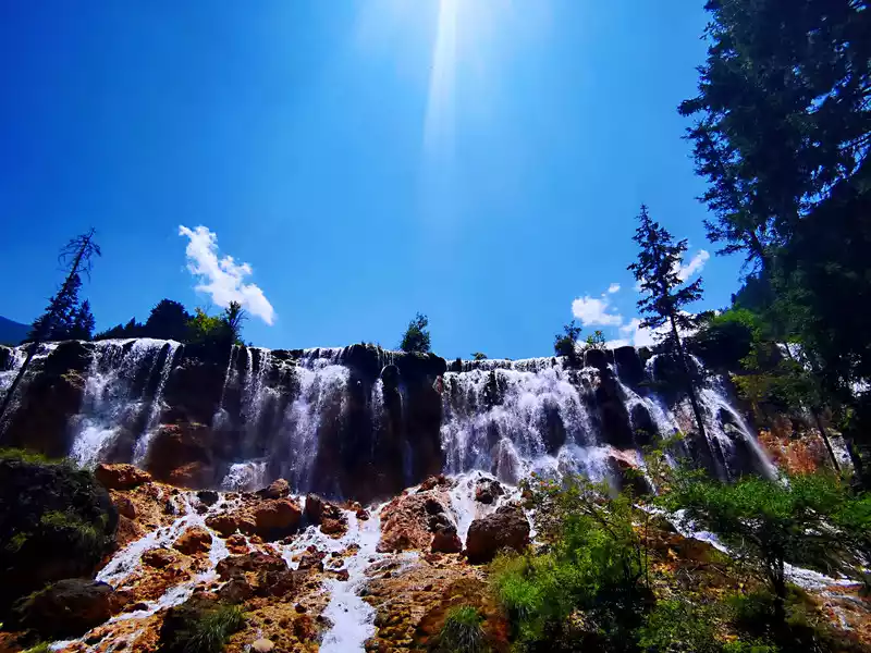 Located about 0.5 kilometers downstream of Wuhuahai, reaching Pearl Beach Waterfall, 2,443 meters above sea level, 21 meters high and 162 meters wide, is a typical combined landscape in Jiuzhaigou, and the scene of the opening of the large-scale TV series "Journey to the West" "You carry the burden, I lead the horse" was filmed. This is also a tourist attraction, and there will be some group photo items of Journey to the West master and apprentice.