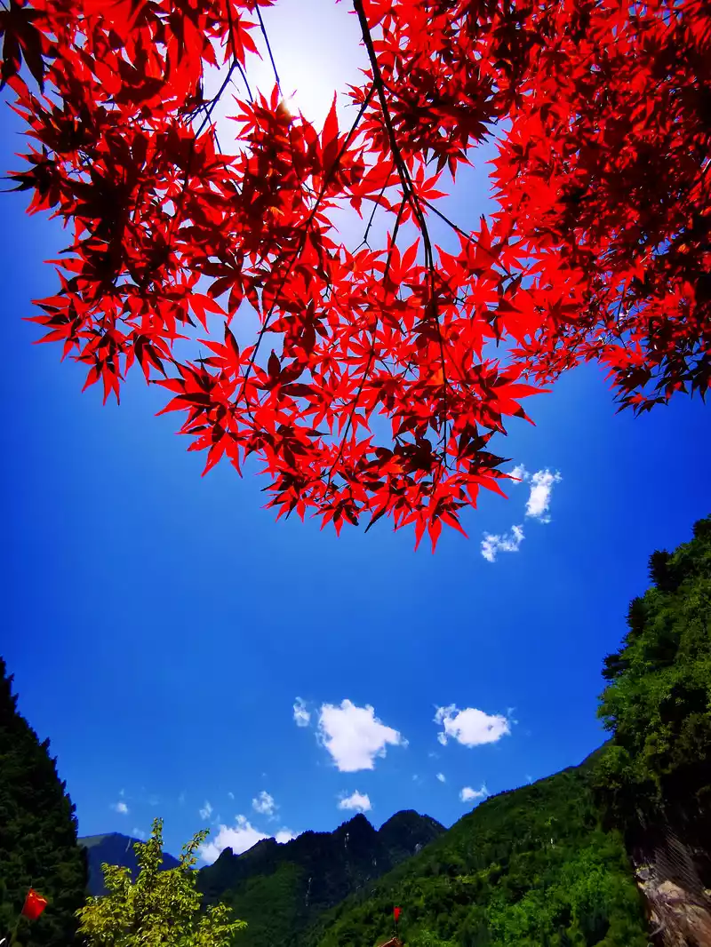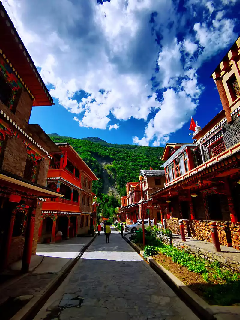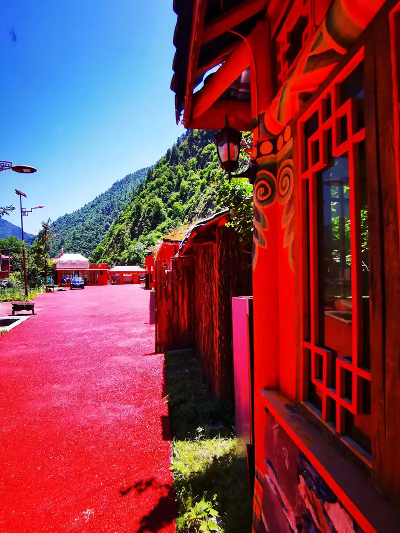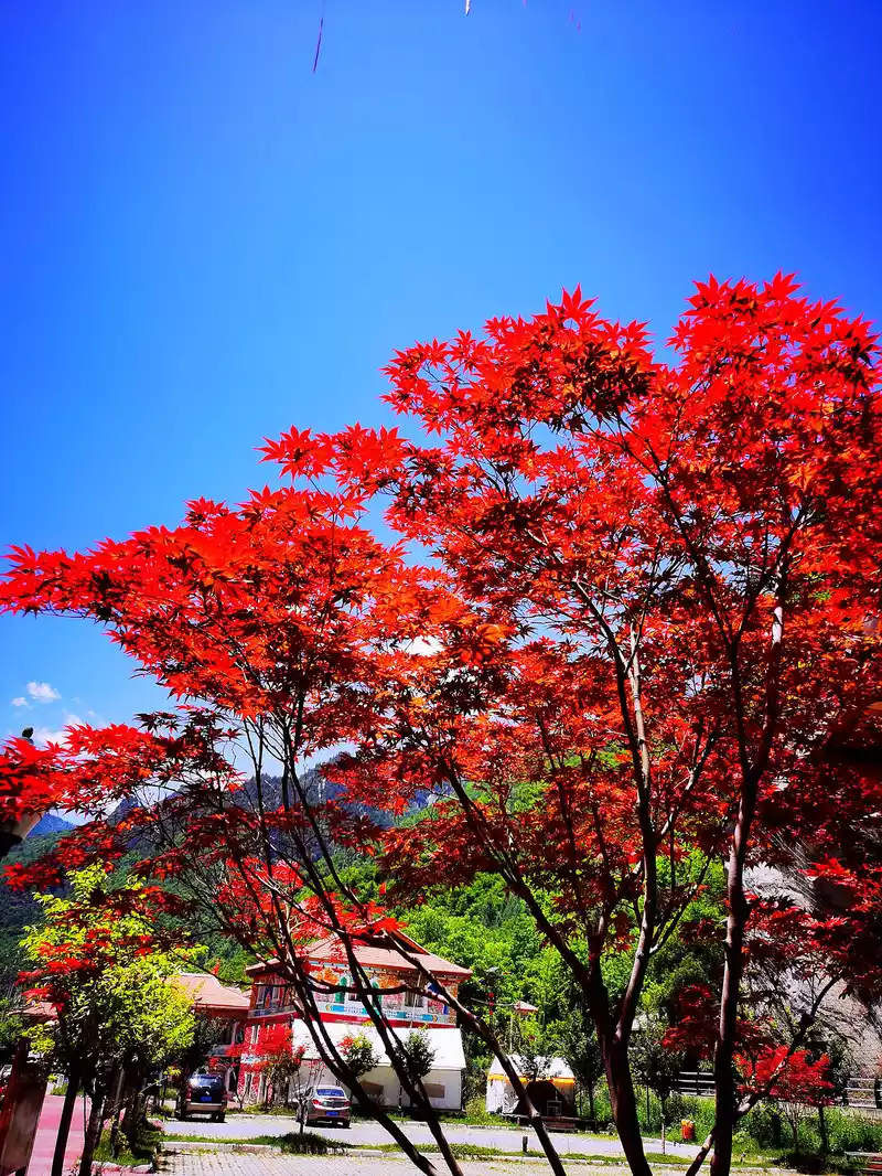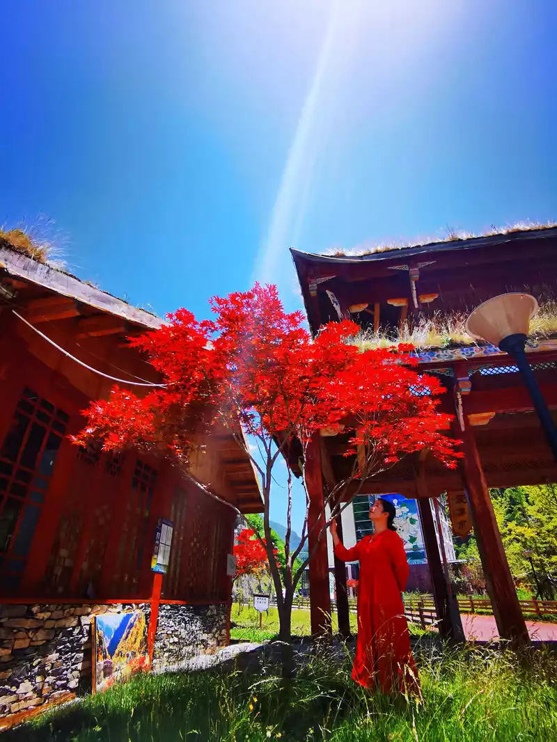 Between Heishui County and Hongyuan Prairie, it is to pass through a mountain, all the way along the Heishui River, and also pass through the Maoerge Hydropower Station Dam, which blocks this section of the Heishui River into a beautiful Heishui Lake; Continue to open, the valley is continuous, the two sides of the river are colorful in autumn, with the blue sky and green water must be very beautiful, we passed by the colorful Jiazu Village, attracted by the colorful houses in the village and stopped, inadvertently found that the red maple in the village is very beautiful, and the blue sky echoes each other, beautiful stunned.