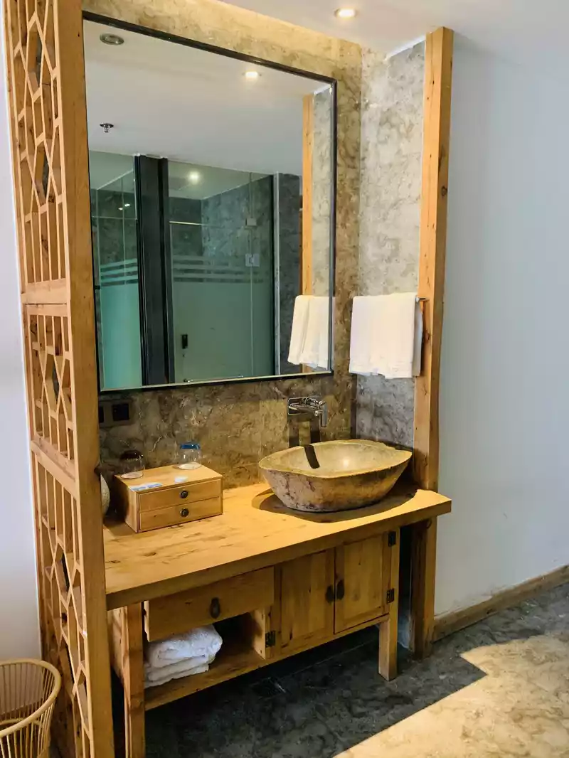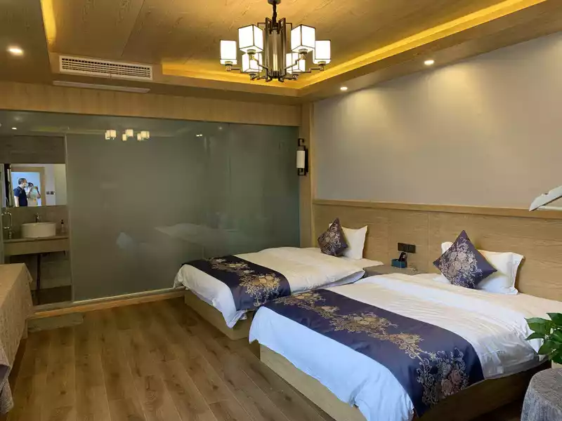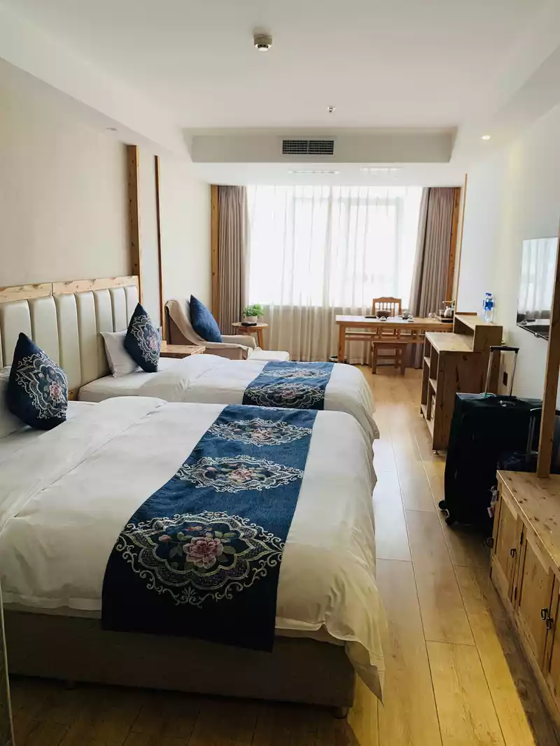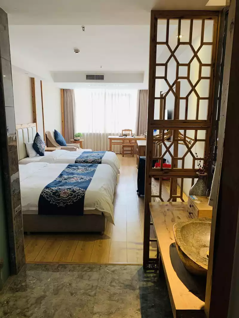The hotel style is a Chinese Zen tea table, the room is simple and elegant as a whole, mainly with log furniture, with a kung fu tea table, suitable for my family who likes to drink tea; The family room space is very large, and the bathroom is separated from the dry and wet independent space, which is very good; The air conditioning is good, the WIFI network speed is good, the hot water is sufficient, and the toiletries are complete.