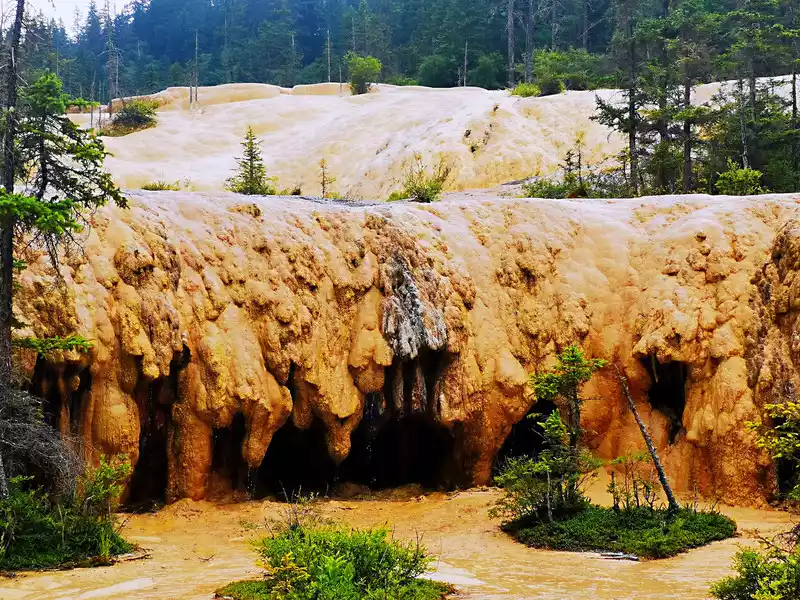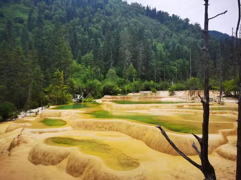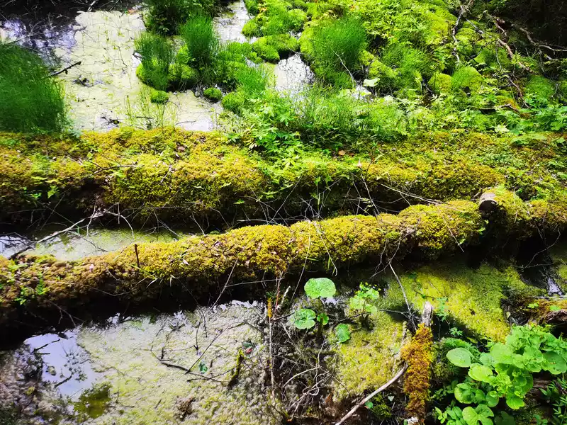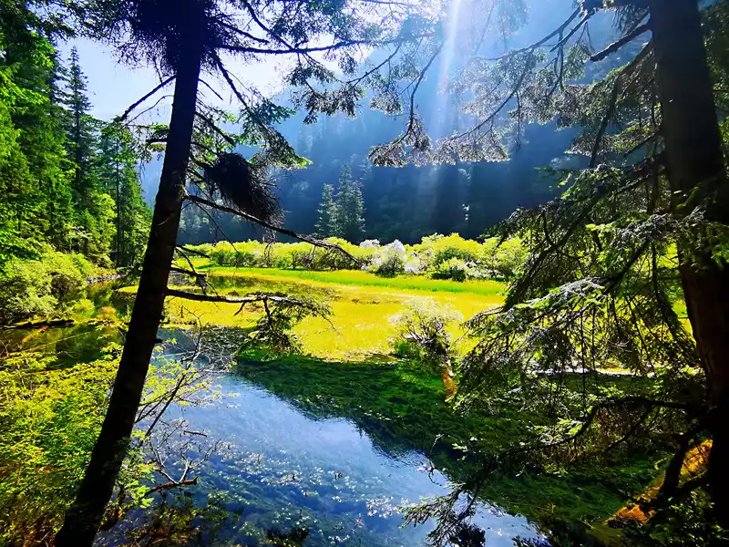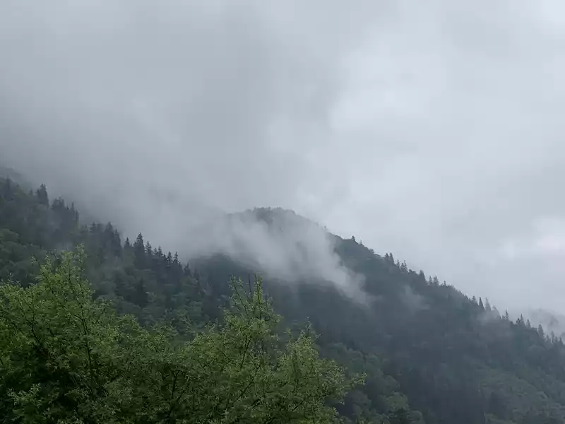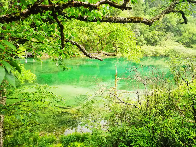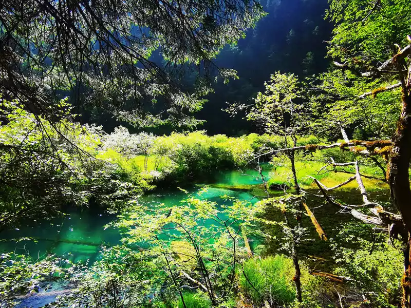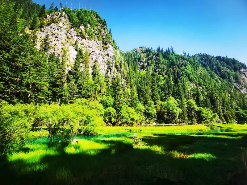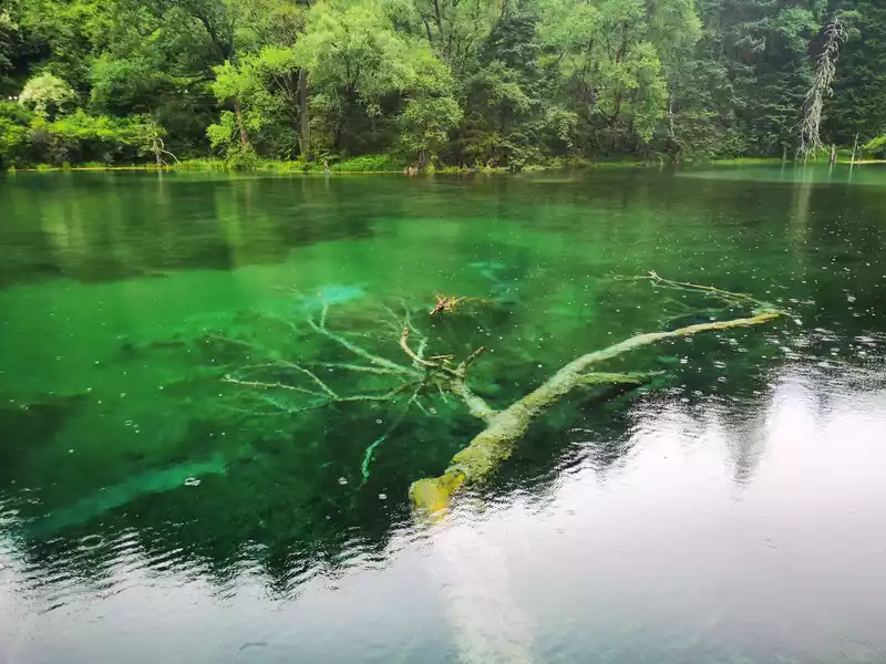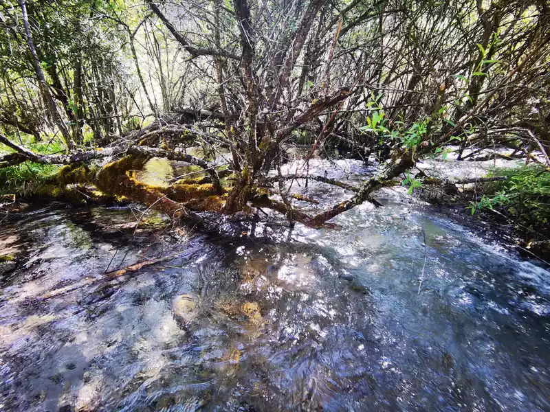 Continue down to the Arrow Bamboo Sea, one of the essence attractions in the Rize Gully, generally the travel time is limited, will get off here, do not go up to the primeval forest, here is more than 2,600 meters above sea level, because of the wide growth of arrow bamboo around, there are some calcified dead wood in the Arrow Bamboo Sea, the dead wood that emerges from the water will grow new small trees, called dead wood in spring, is a spectacle.