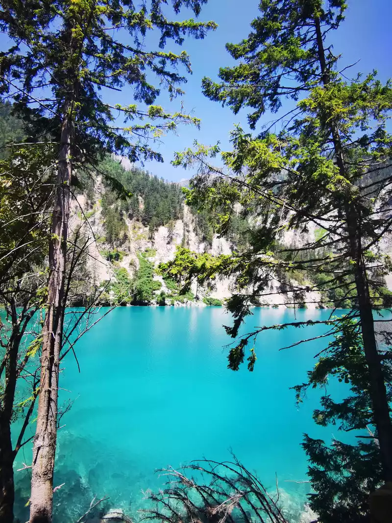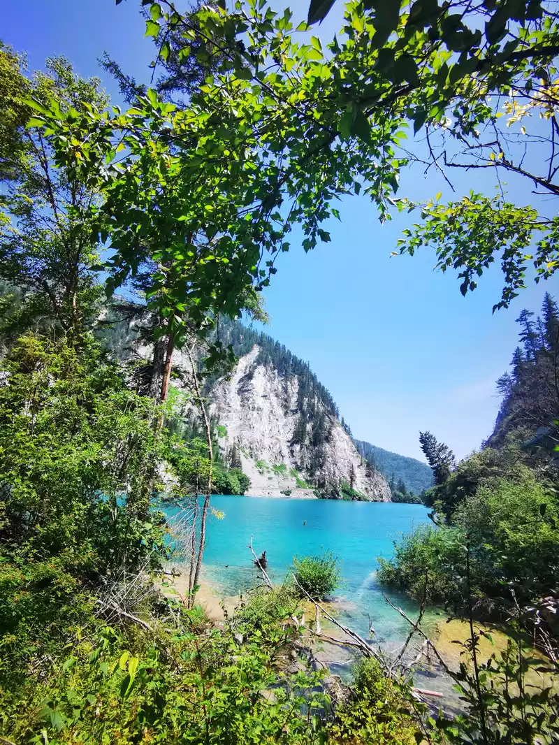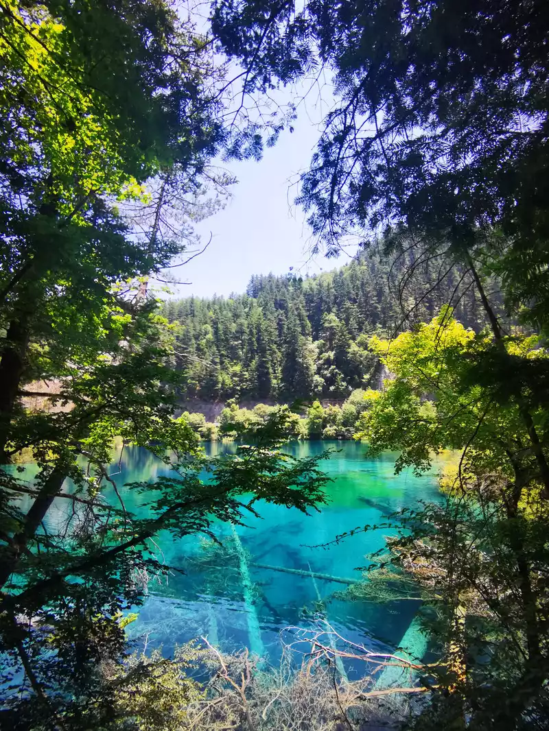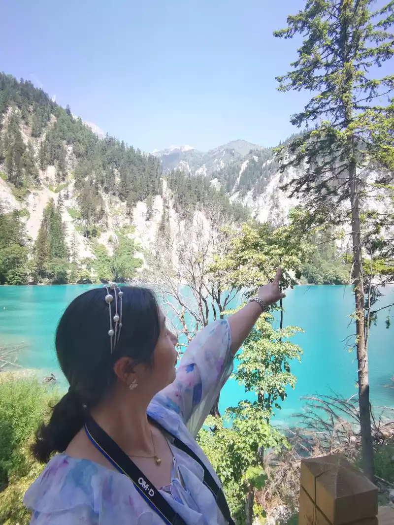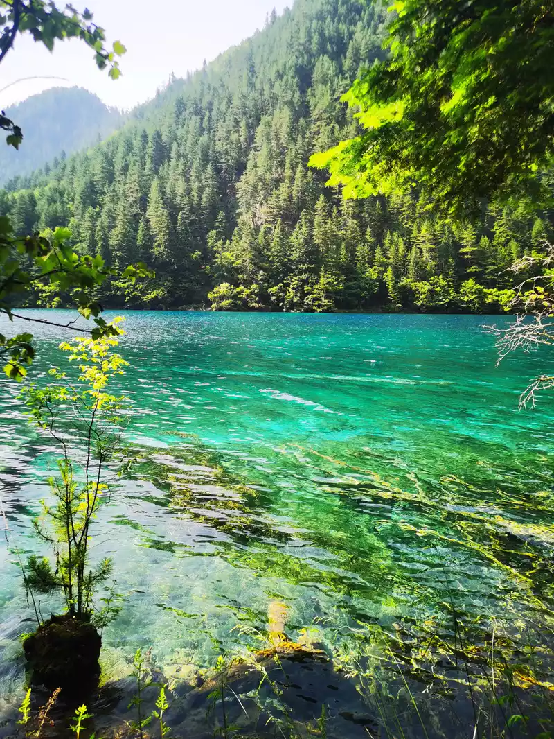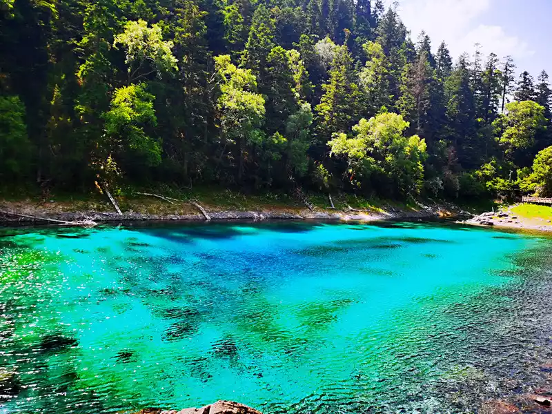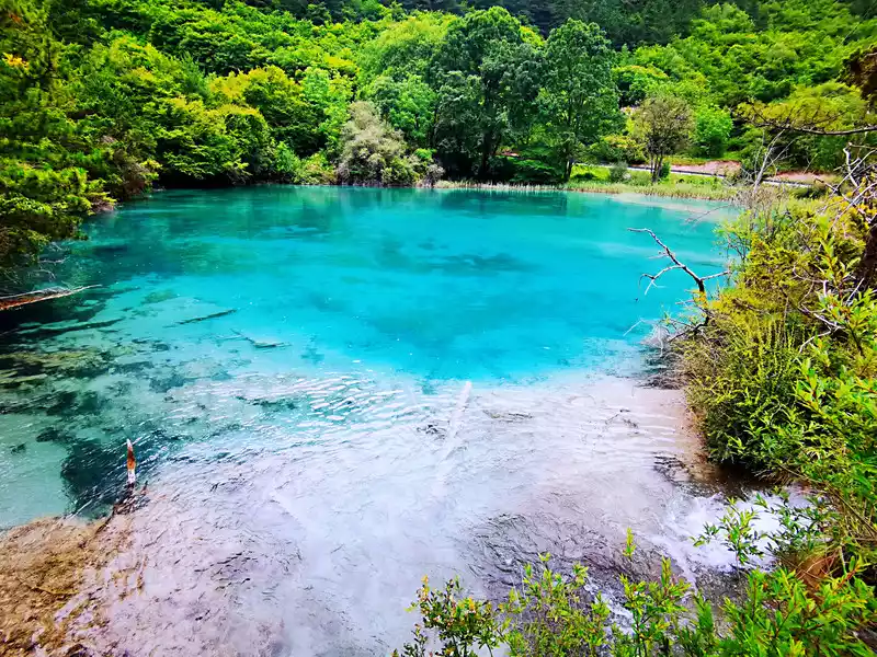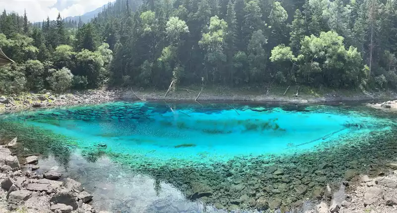 The next stop is another essence attraction in Rizegou - Panda Sea, which is 2587 meters above sea level and 14 meters deep, and it is said that giant pandas are often active here, so it is named Panda Sea. The water in Panda Sea is a bit blue-green, not very dark, but it looks particularly beautiful in the sun.