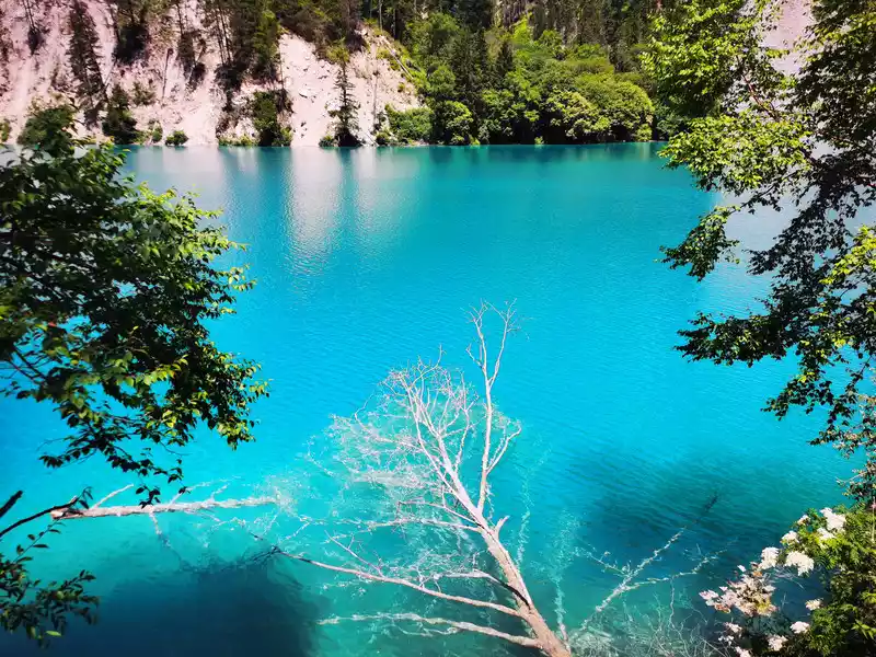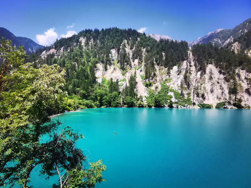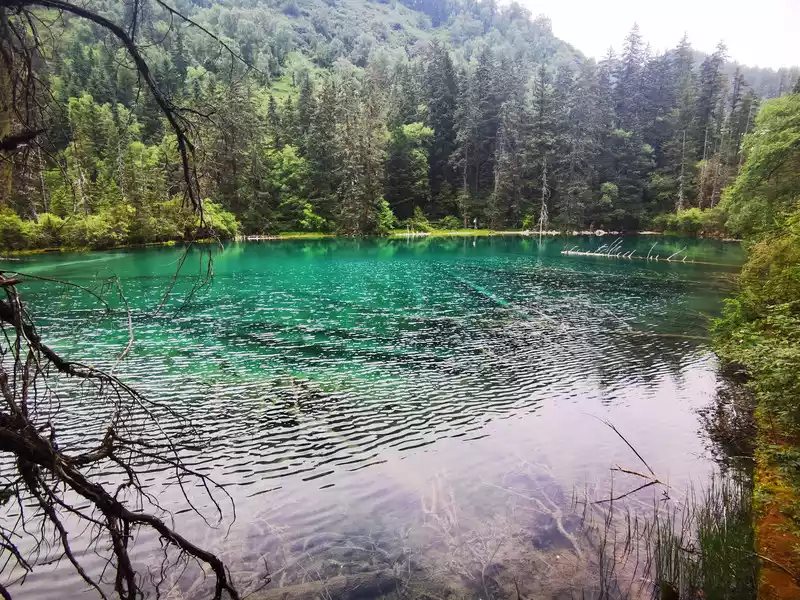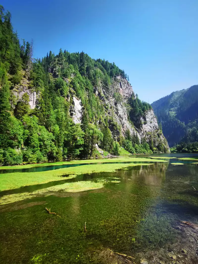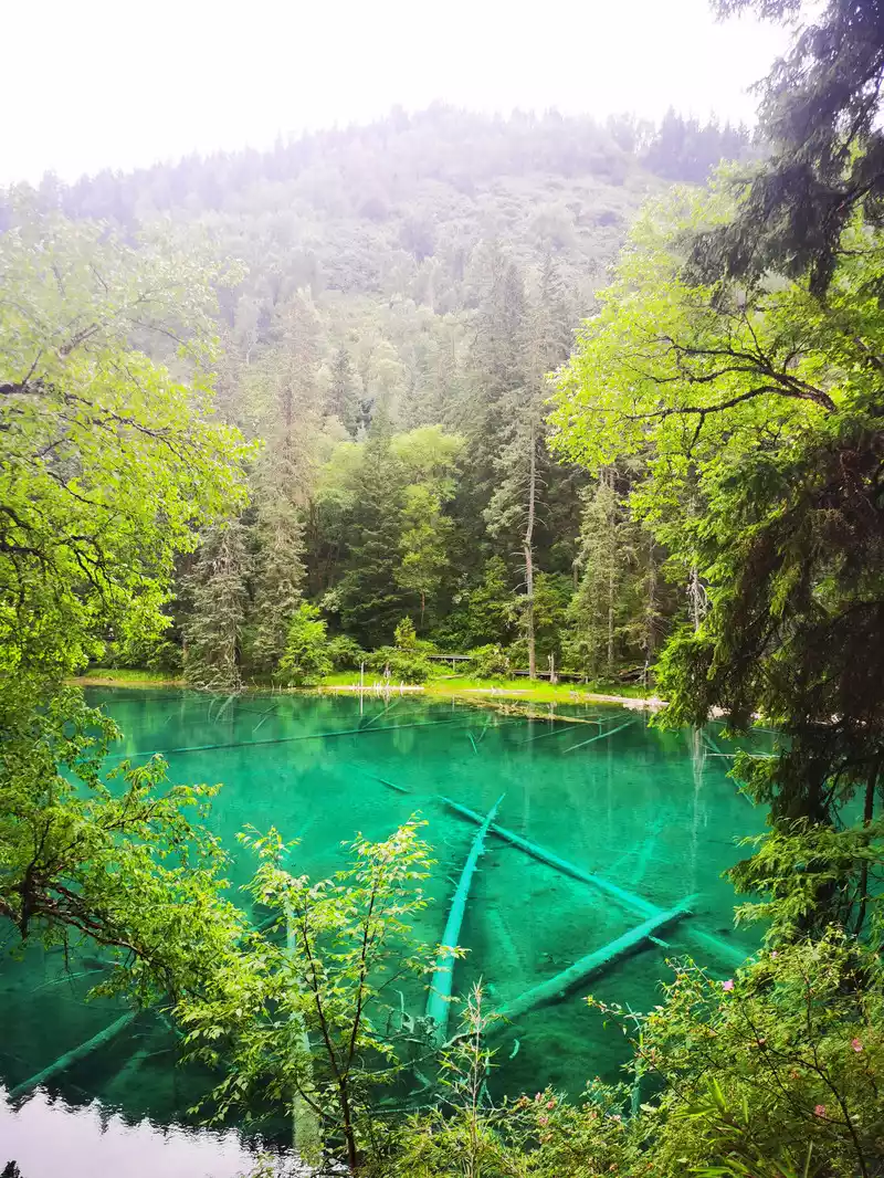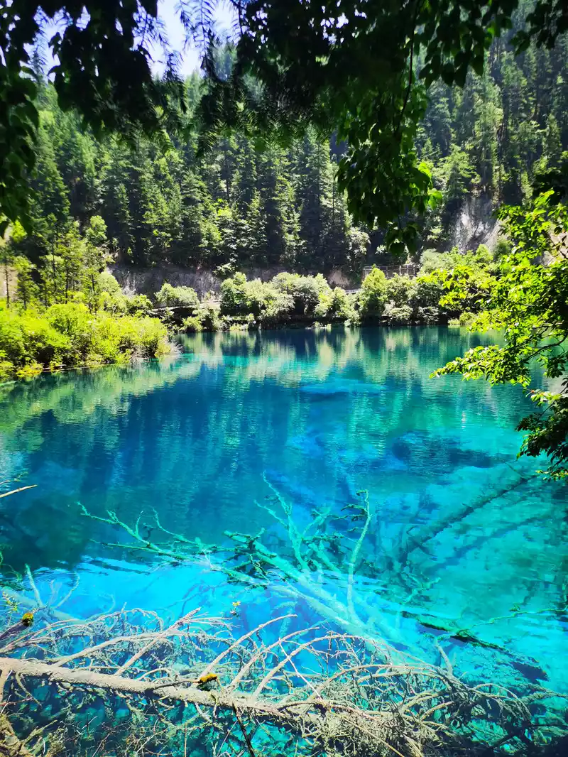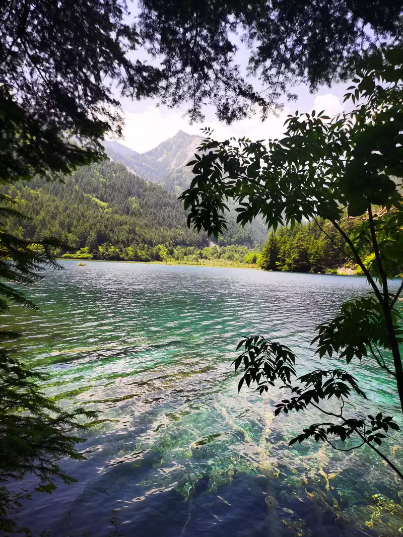 The next stop is another essence attraction in Rizegou - Panda Sea, which is 2587 meters above sea level and 14 meters deep, and it is said that giant pandas are often active here, so it is named Panda Sea. The water in Panda Sea is a bit blue-green, not very dark, but it looks particularly beautiful in the sun.