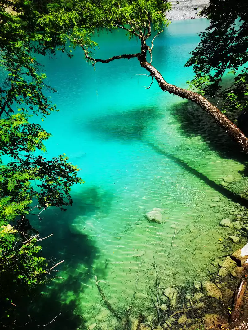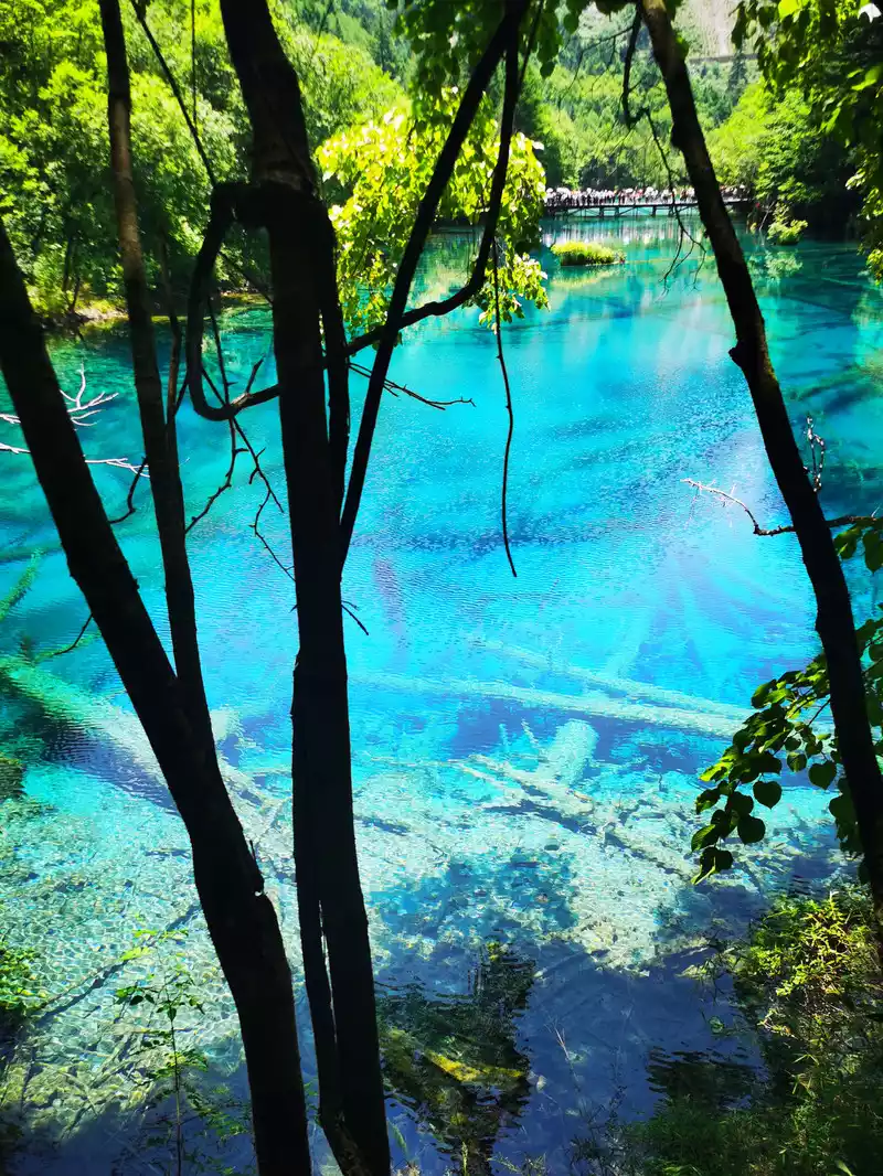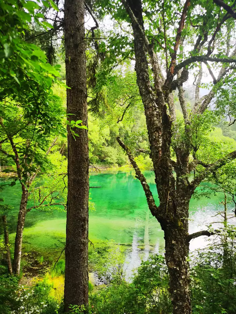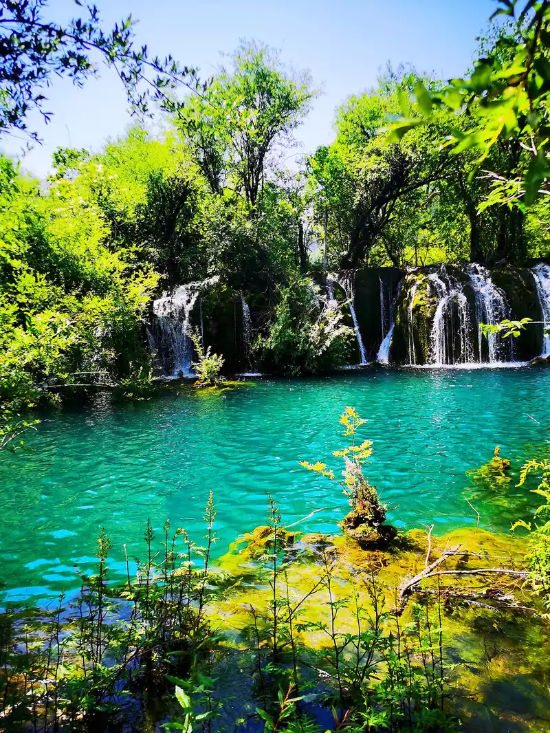 On the sightseeing bus from Shuzheng Waterfall to Goukou on the way back, I accidentally saw a beautiful sea, and then got off the bus, which is the sea of sparks restored after the earthquake, with an algement of 2,187 meters and a depth of 9 meters, located between the Shuanglong Sea and the Wolong Sea. In the 2017 Jiuzhaigou earthquake, the most affected was the sea of sparks, and after three years of unremitting efforts and scientific repair, the sea of sparks is now back. Due to the discharge of spark seawater after the earthquake, the water area of the downstream Shuanglong Sea area expanded, forming a new attraction - Shuanglong Sea Waterfall.
