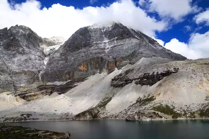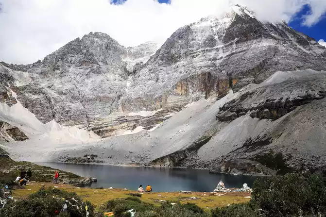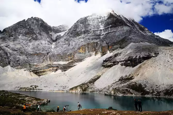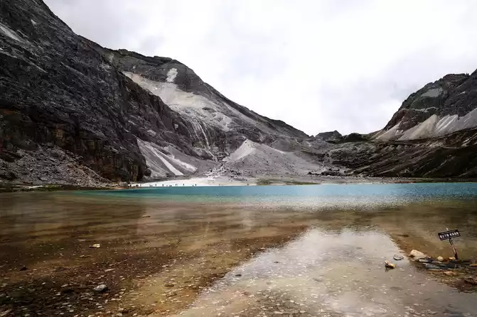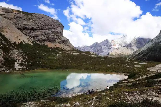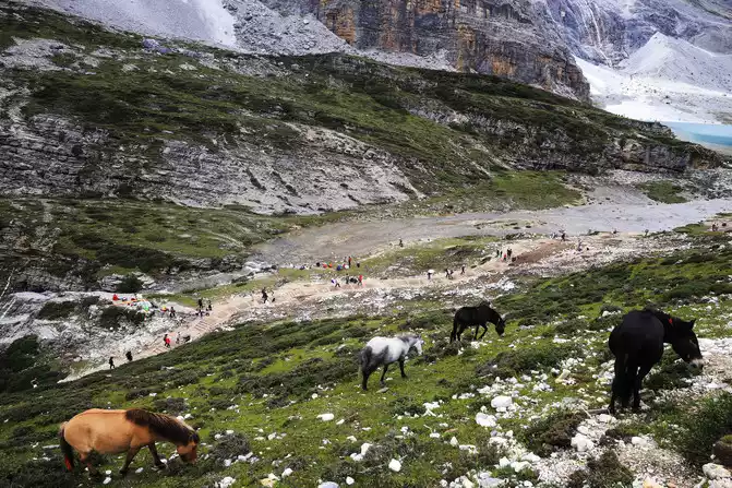 Then continue to ascend and after almost 4 and a half hours of trekking, you will reach the last attraction at 1:20 pm - the five-colored sea at an altitude of 4700 meters. The five-colored sea is named because it produces five different colors under the refraction of light. Its real name is "single increase measure". It is located between Xiannai Ri and Yangmaiyong, at an altitude of 4,700 meters (high on the lake surface), the lake surface is circular, with an area of 0.7 hectares, and the modern ice valley extends down to the lakeside, with snow-capped mountains reflecting the lake, which is a famous sacred lake in Tibet.