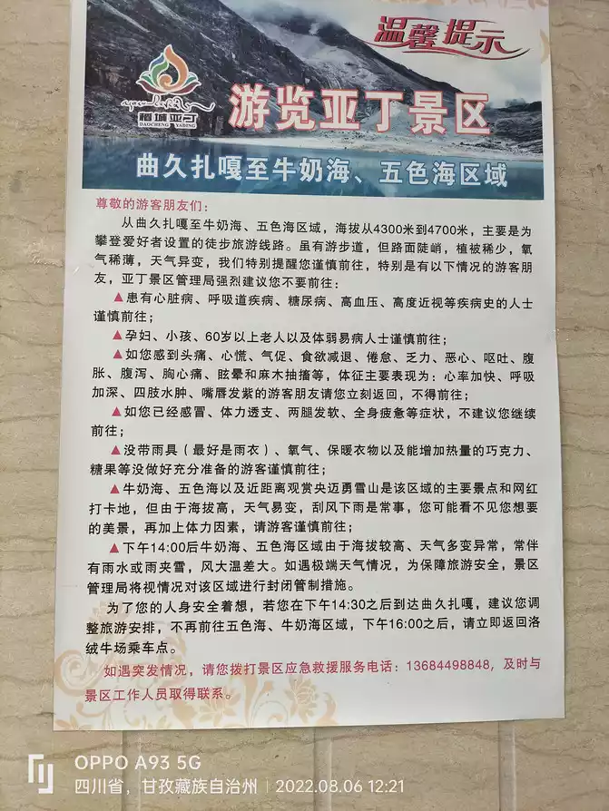 No. 7 At 8 o'clock in the morning, after breakfast, take the scenic delivery bus to Zhaguan Beng at the No. 4 camp in Aden Village, and then take the battery car (fare 80 yuan) to Luorong Cattle Farm (3.4 kilometers away), and then the most arduous journey of this trip, gradually going up 5 kilometers on the 4,100-meter plateau to the milk sea and the five-color sea at an altitude of 4,700 meters.