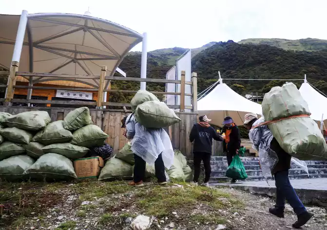 On the way down the mountain, I met two sanitation workers, and after talking, I learned that their task was to pack the garbage in the garbage cans along the way in woven bags and carry them to the garbage concentration point where the garbage collapsed, and then transfer them to the garbage station by car. It is 4 round trips a day, 1.5 km one way. On the way to carry it, it is very hard to check the scattered garbage left by tourists on the wooden plank road and under the wooden plank road, put it into woven bags, and the work is very hard! It is the hard work of sanitation workers that ensures the cleanliness and tidiness of the scenic spot, provides tourists with a good visiting environment, and pays tribute to sanitation workers!