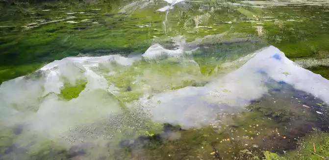 The snow-capped mountains melt and flow down, the snow water forms a trickle