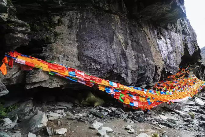 Countless prayer flags dress the mountains into a colorful world, symbolizing purity and auspiciousness
