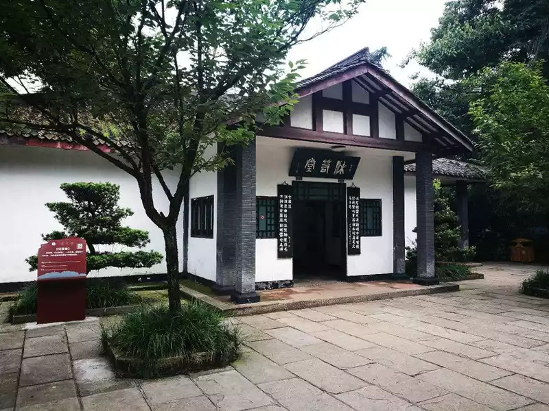 A few tens of meters east of the Lingbao Pagoda, there is a quiet small courtyard hidden in the dense trees. Walking into the courtyard, there was no one there, and the plaque of the courtyard door had the words "Moruotang" written on it. Moruotang is in memory of Guo Moruo.