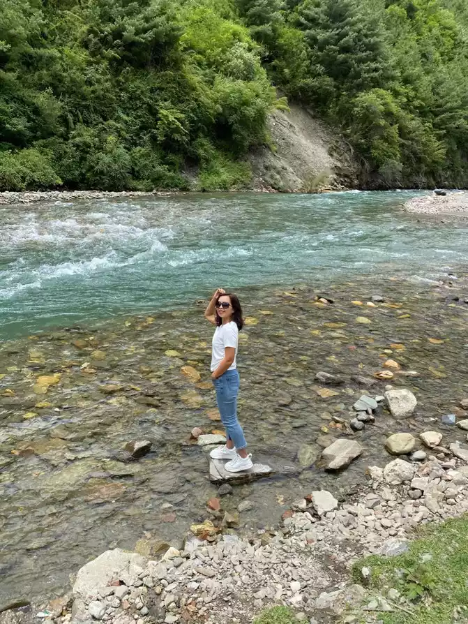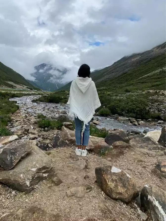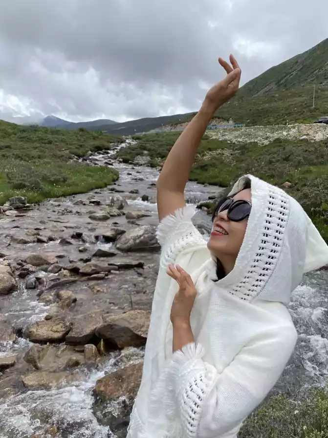 The snow-capped mountains in the distance, the slowly flowing stream, looking up at the clouds and mist in the blue sky, bowing your head and the breeze kissing the tips of your hair. Is there a more beautiful time than this? Qi Ma was intoxicated by this beautiful scenery, her heart was calm and beautiful!