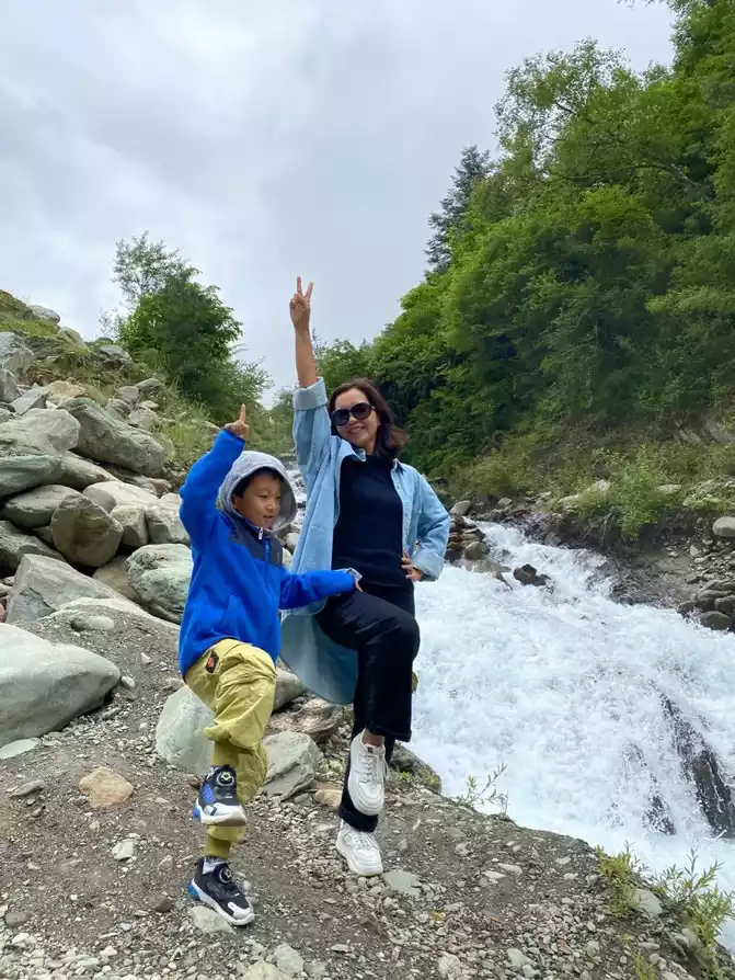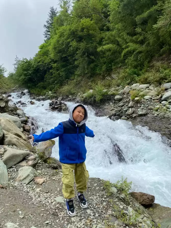 />The next day I set off again, a mountain stream on the side of the road, like a hada swaying down from the top of the mountain, the roaring water deeply attracted Qi Xiaobao, the first time he took the initiative to ask to take a picture, the little guy spread his arms, stood on tiptoe, as if to fly off the ground. Take a leisurely North Nose, this is a 3500+ plateau!