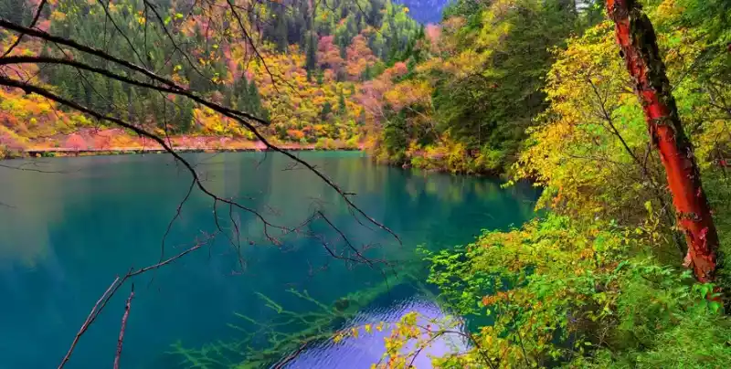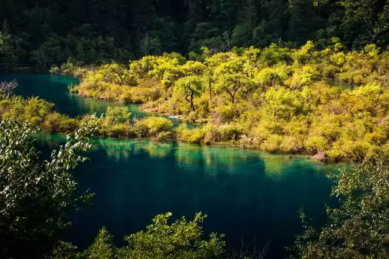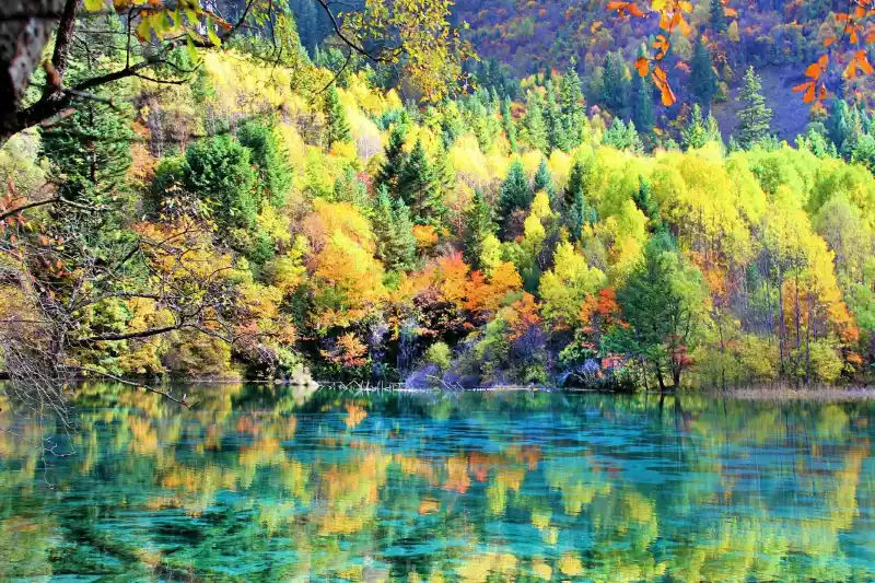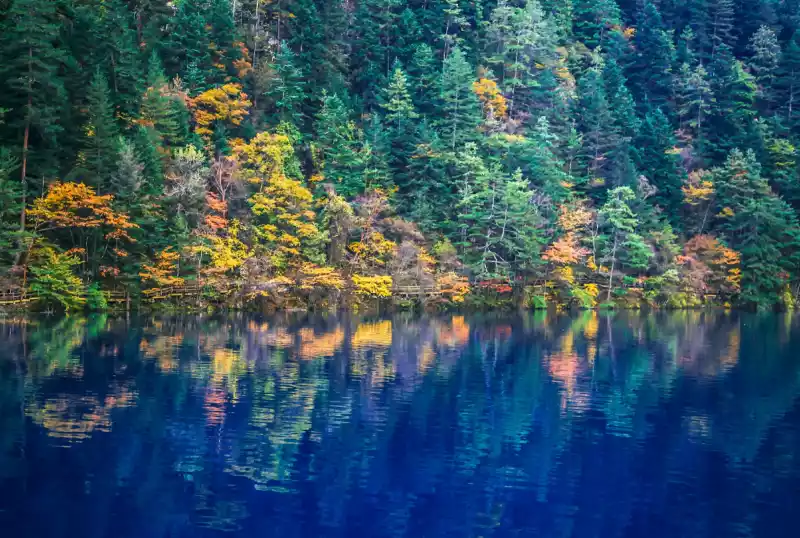 Wuhua Sea: Wuhuahai is located in the middle of Rizegou in Jiuzhaigou, and the water surface is colorful. A section of the plank road on the west side is one of the best viewing points, and the end of the plank road is the junction of the outlet of the Five Flowers Sea and the Peacock River, which is the area with the highest concentration of colorful leaves in autumn. Follow the Peacock River north for about 100 meters to the Ring Road, and if you go southeast along the road, you will see a large stone, which is the Tiger Rock, which is the best place to take a panoramic view of the Five Flowers Sea.