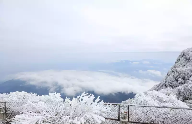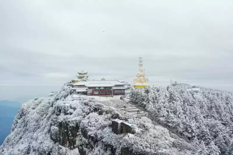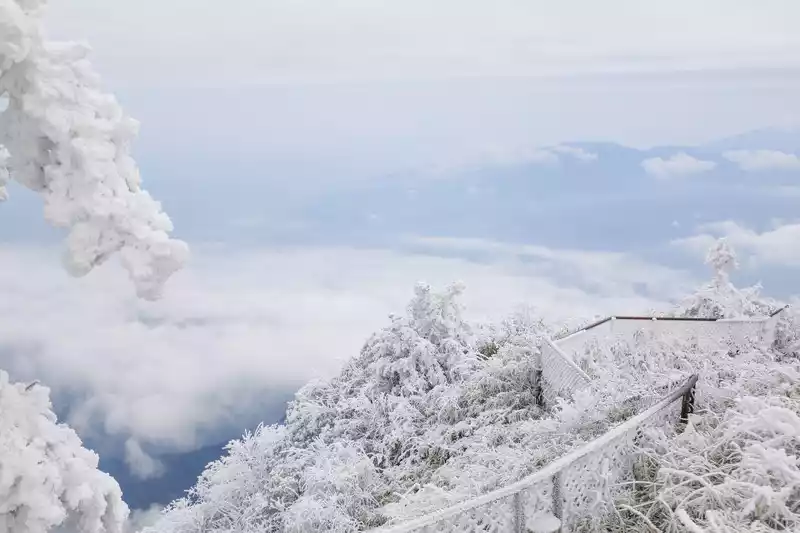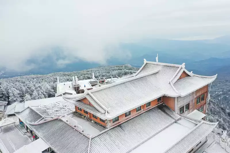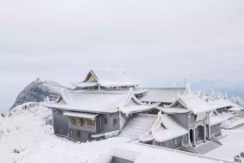 At this time, the sky and earth are white, the surroundings are like white tents pulled up, and the peaks of Emei Mountain in the distance are overlapping, covered with a layer of white snow, and like the monstrous white waves rolled up by the sea, lingering and ethereal, Mount Emei has four wonders - sunrise, sea of clouds, Buddha's light, and holy lamp, if you want to see it, you must live in the golden top to have a chance.