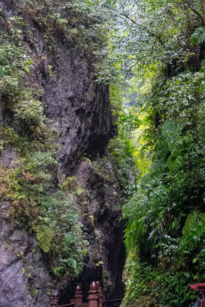 The path from Qingyin Pavilion down to the first line of sky is winding and tortuous, and we can see that there are two steep cliffs, and only a beam of light falls from the sky, guiding the direction in the gap, as if the mountain is split by a sharp axe with a strong swing of the sky, leaking out of the blue sky through the sparse vines and dense vines.