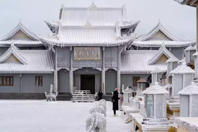 If you are lucky enough to climb to the top of the mountain, you can see flying snowflakes, fluttering in mid-air, trickling and dancing, dyeing the sky and earth into a white expanse, The radiant golden dome and the ice and snow world complement each other and shine.