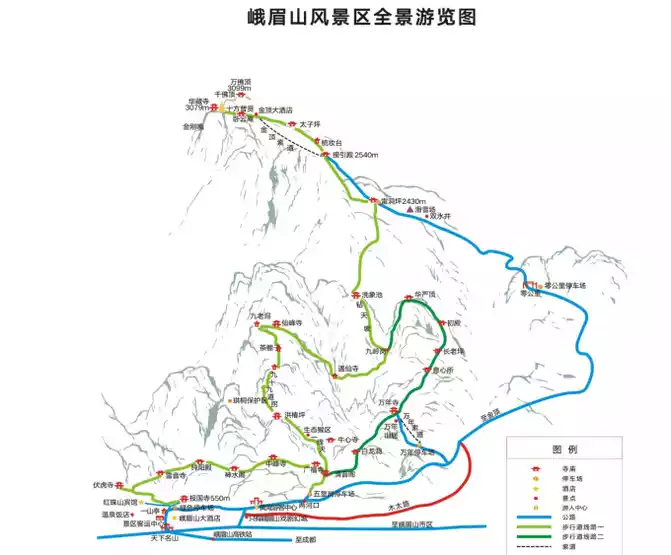 As an important scenic spot in the middle of Mount Emei, Wannian Temple is also a good transportation hub, which leads to the Golden Dome and descends to the mountain pass. Here is a road map of Mount Emei for everyone, you can play according to your own situation. The route we took was the classic mid-mountain hiking route mentioned above, after all, in addition to the snowy scenery, the first time we came to Mount Emei and we were looking forward to meeting the Emei monkeys.