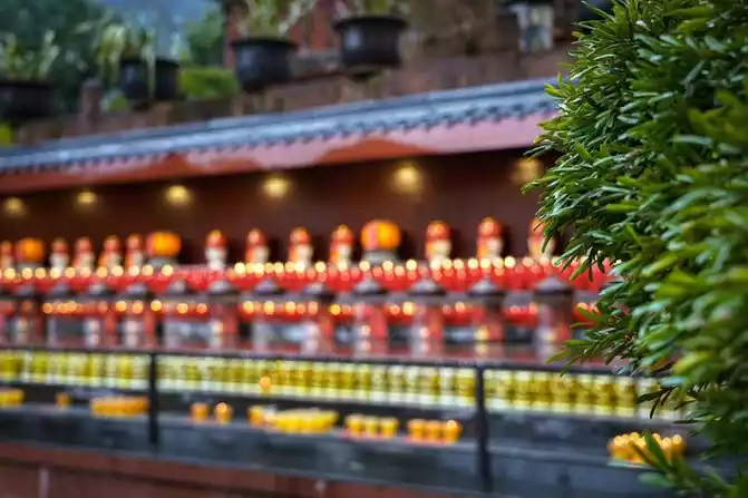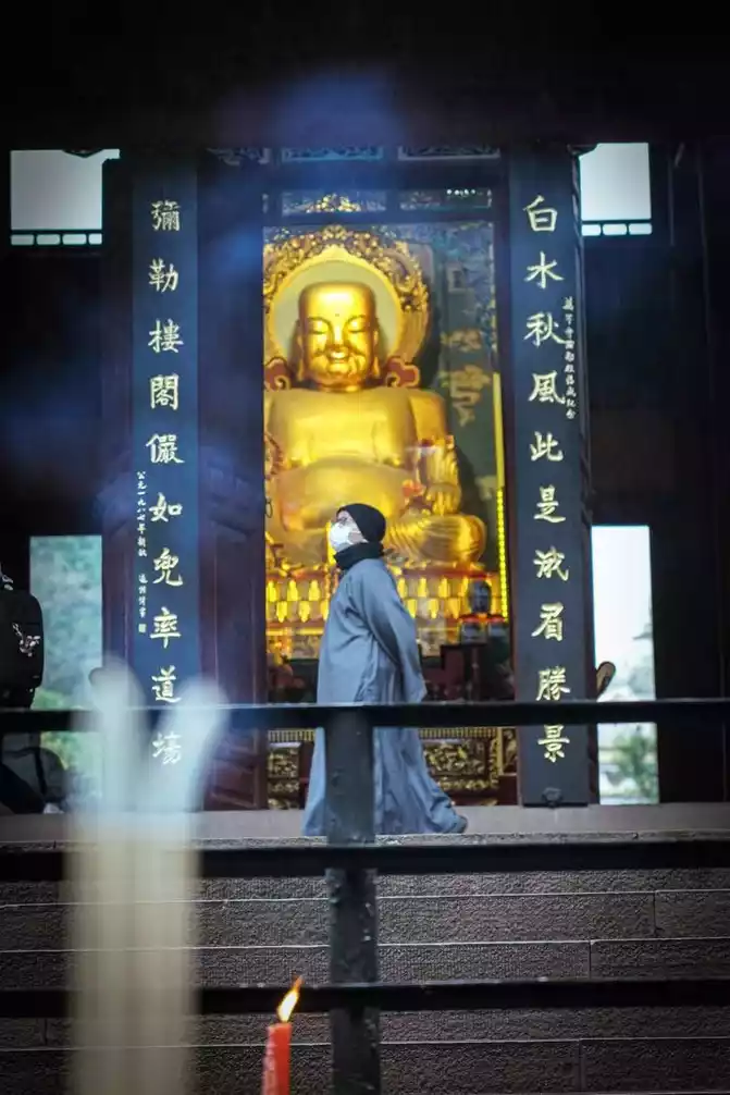 in the Wannian Temple, offering a pillar of incense, lighting a lamp