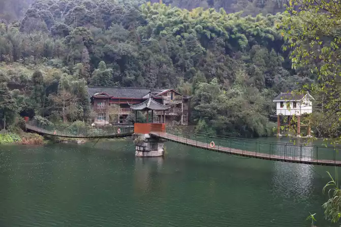 After seeing the monkeys in the Ecological Monkey Area of Mount Emei, you need to turn back to Qingyin Pavilion and hike to Wuxian Ridge. On the way to hike, you will see a lake as emerald-like as blue, and a quaint suspension bridge connects the two sides of the river, which is particularly beautiful.