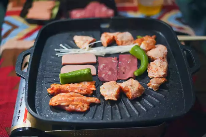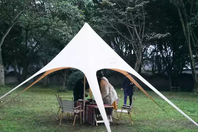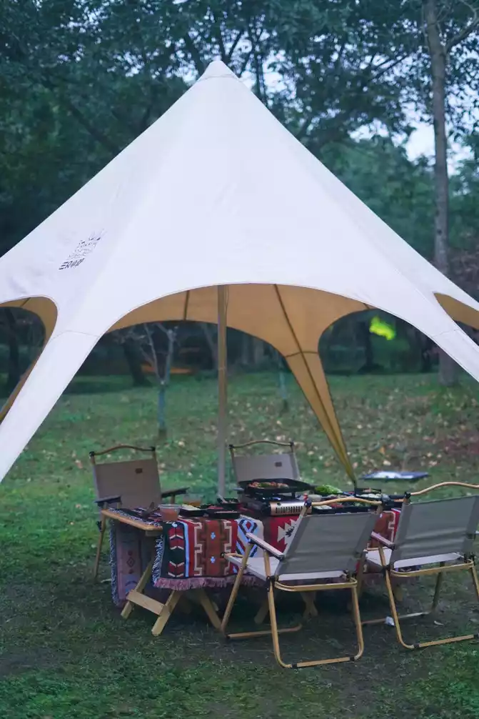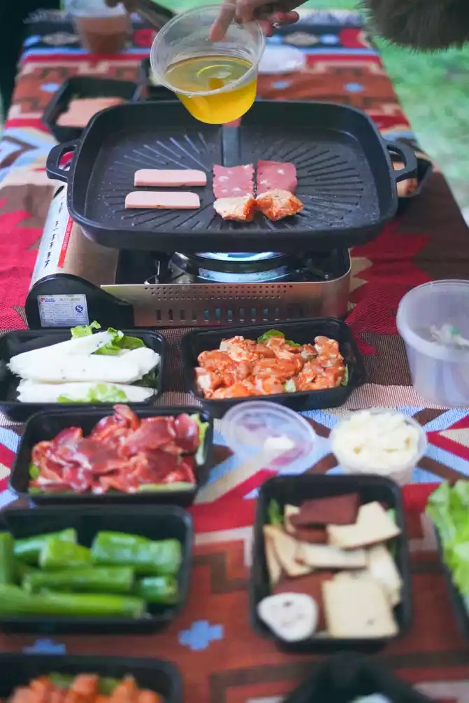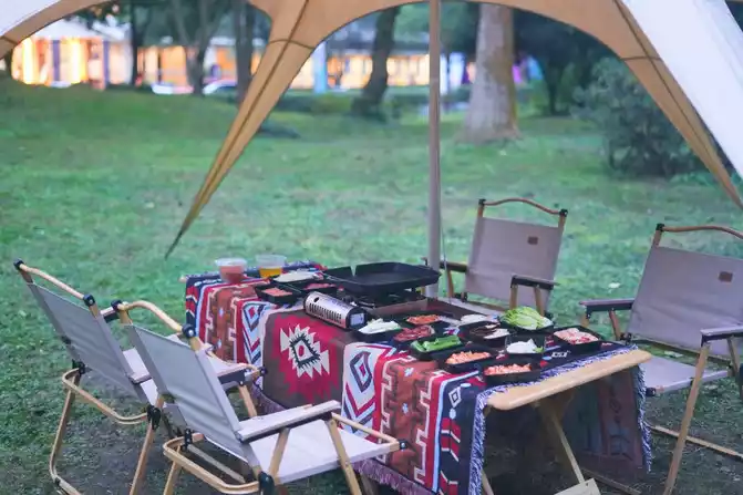 On the lawn outside the hot spring center of Mount Emei, there is an outdoor camping area with camping tents. Sitting around the table with friends, facing the slight breeze, watching the roaring fire burning under the oven, putting the prepared ingredients on the baking sheet, looking at the plump meat slices, sizzling under the action of temperature, from raw to cooked, dipping the soul dry dish, putting it in your mouth, and having a drink, it's wonderful.
