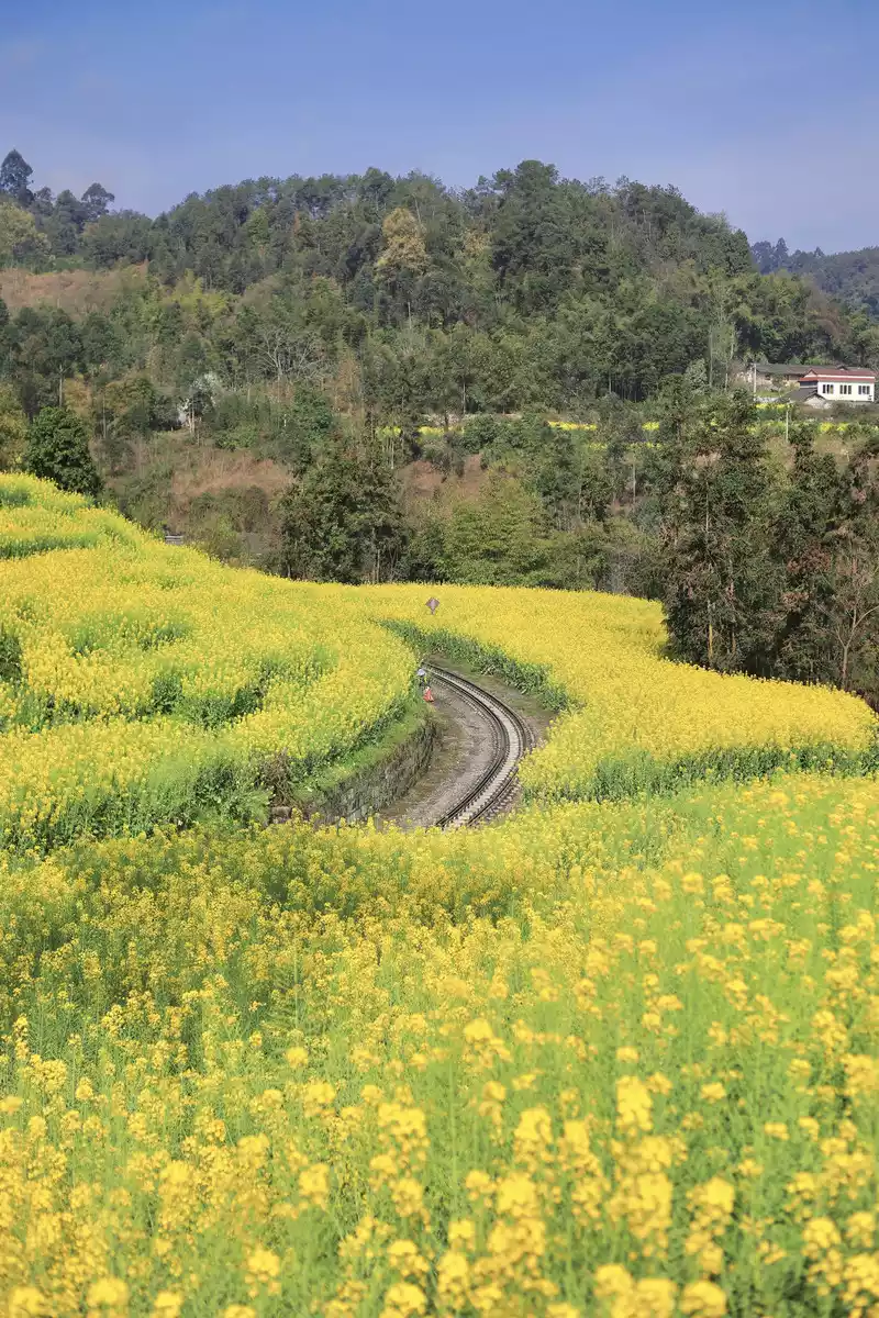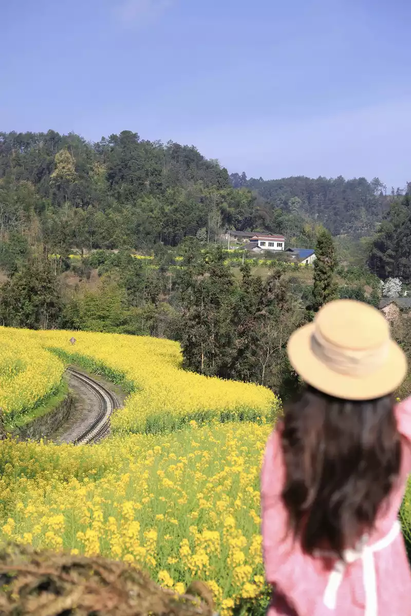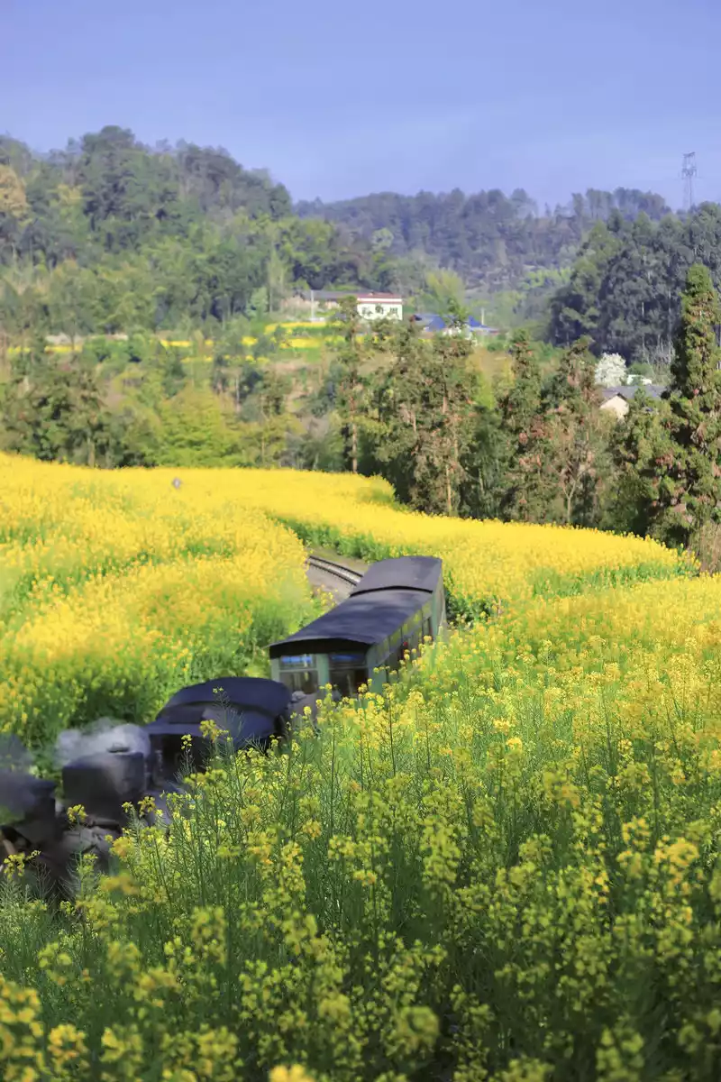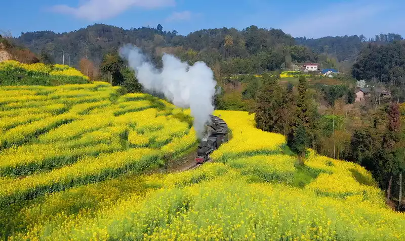 Spring is getting warmer, take the #Train to Spring# Encounter Jiayang in a hundred years... When the retro steam train shuttles through a large sea of golden rape flowers, as beautiful as a fairy tale world, Qianwei's Jiayang rape flowers have bloomed, are you ready to set off?