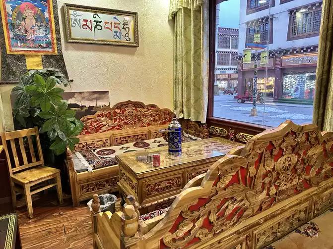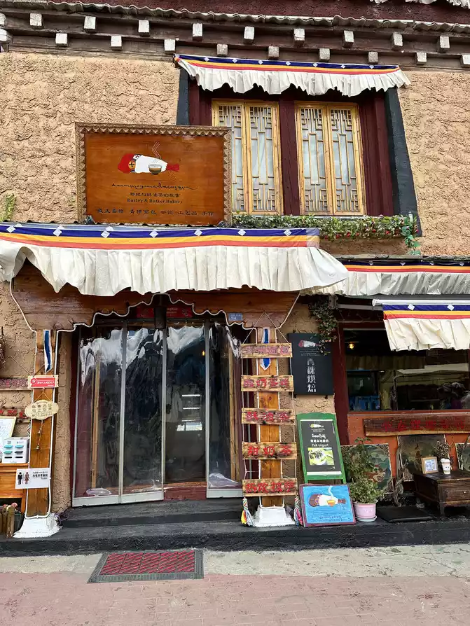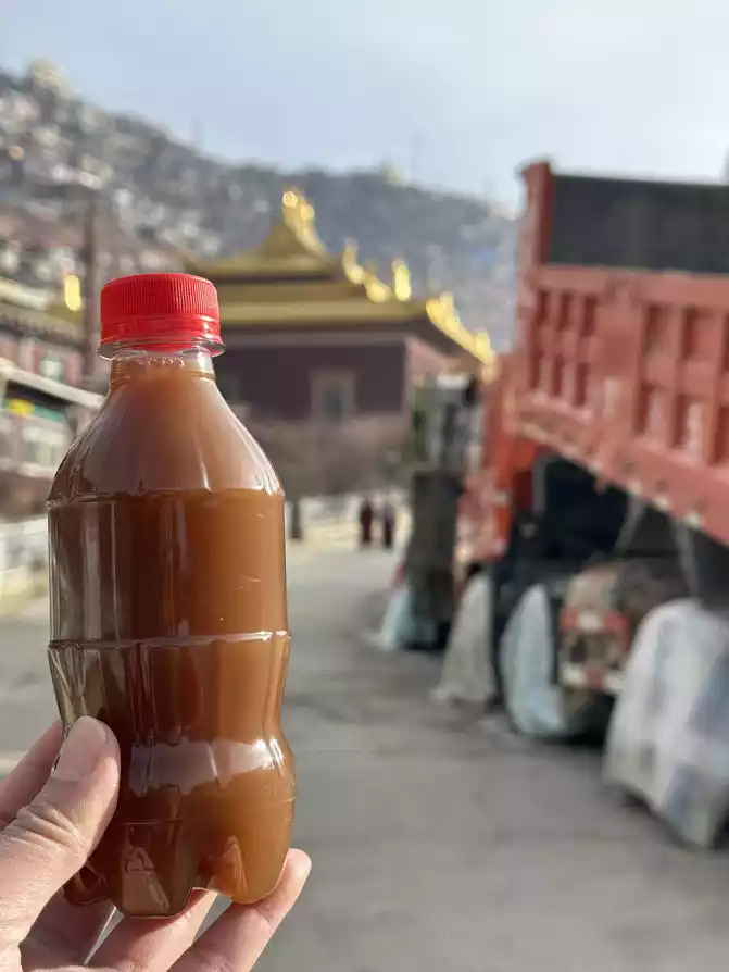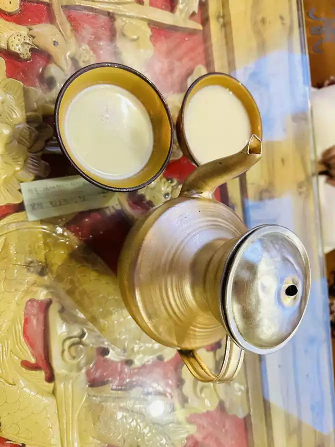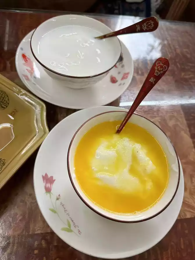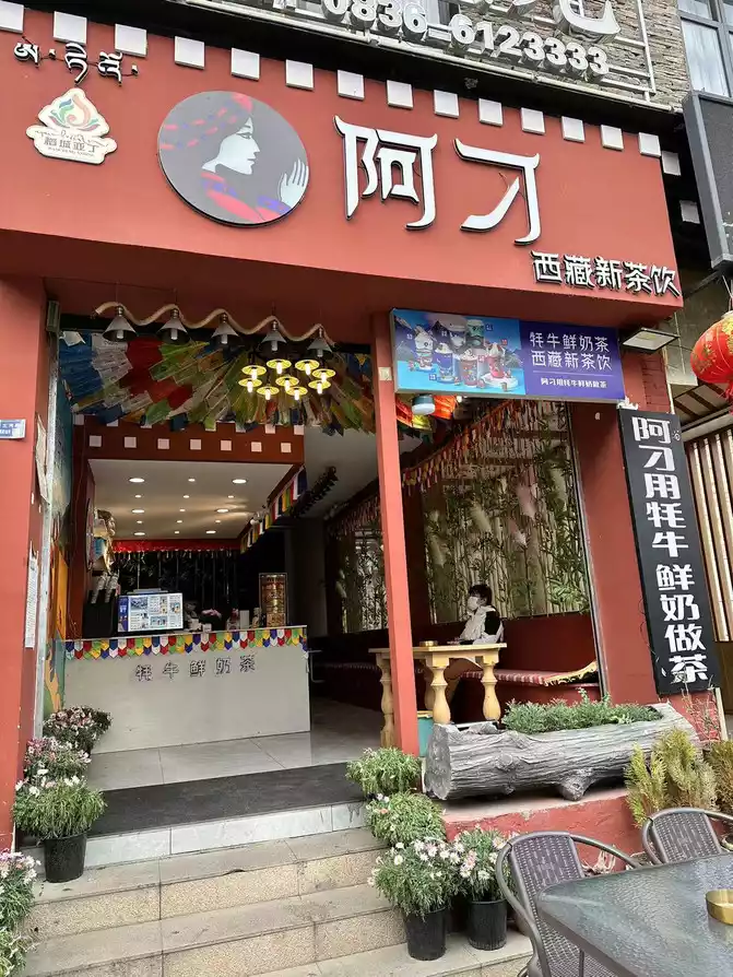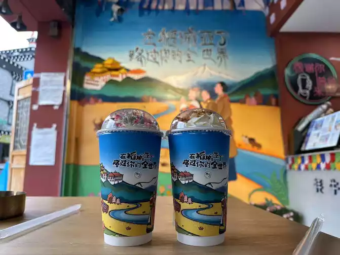 After coming out, I called the driver's little brother to pick us up and take us back to the hotel, went back to the hotel to put down our things, packed up and went out to forage for food, strolled around the town, saw the new Tibetan tea of Adiao, went to the countryside to drink local milk tea, I ordered a cup of Ramlatso (translated as a fairy hehe), and my girlfriend ordered a cup of Gesang Meadow.