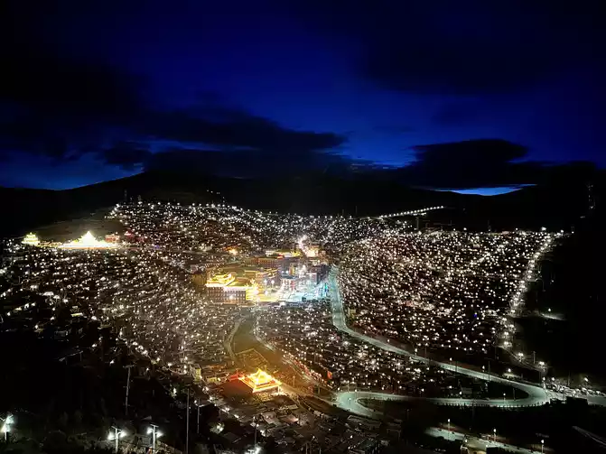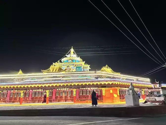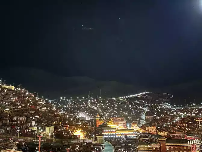 Sure enough, I hardly slept all night, and I held my breath as soon as I lay down at an altitude of 4,000, even if I drove the oxygen concentrator to inhale oxygen, I was still a little out of breath, plus I contacted the car into the Buddhist academy the day before, and agreed to pick me up at the hotel at half past four in the morning. Packed up neatly, pulled the luggage and went downstairs at four o'clock, the luggage was put at the front desk of the hotel first, and then the Tibetan brother who picked us up at half past four pulled us to pick up the others and drove in the direction of the Buddhist academy, almost half an hour's drive, arrived at the gate of the Buddhist academy, got out of the car and saw the stars in the sky, felt that I could reach out and take it off, after seeing the starry sky, I started a thrilling experience no less than an escape room, ahhhhh, the Tibetan little brother first looked at the situation in the dark, and then called us to climb a slope together After walking for almost a quarter of an hour, the people inside changed cars and pulled us in the direction of the upper part of the mandala, pulling to the stairs with a long steep slope from the mandala, and our trip officially began.