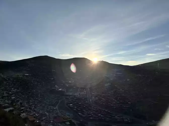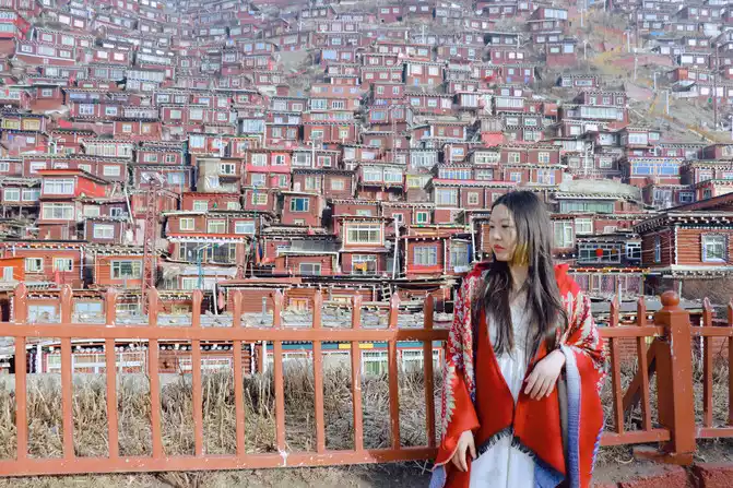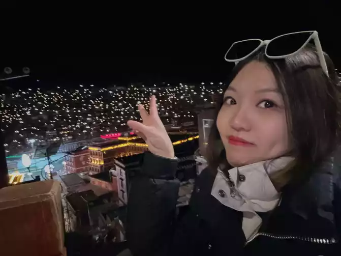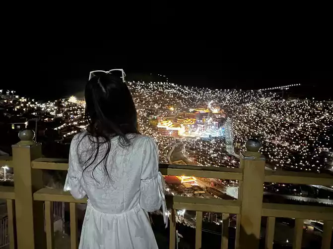 From the mandala to the west along the mountain is the observation deck, the whole section of the road is relatively dark, the street lights are not very bright, and I met a couple and walked over together.Arrived at the observation deck at about six o'clock, the dawn on the plateau was later, it was still dark at six o'clock, or the night view, and then at the observation deck at an altitude of more than 4,000 people, I took off all my down jackets and jackets, and started taking pictures in my carefully prepared little skirt, to be demeanor and not temperature, in this place where there is no lack of oxygen but no lack of faith, the dream is realized in Seda ~ probably such a cold temperature is only I am so hard haha.