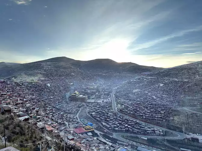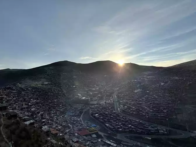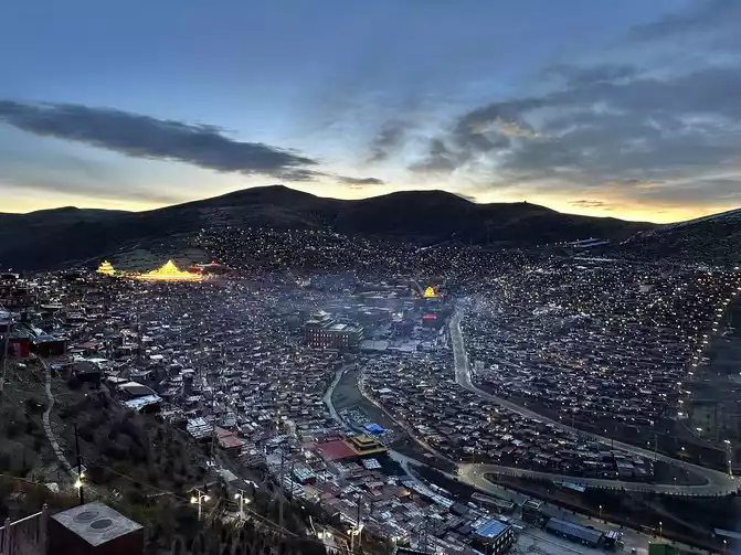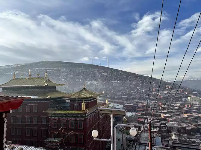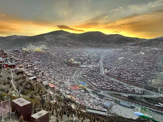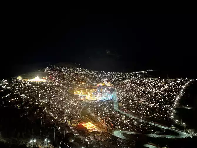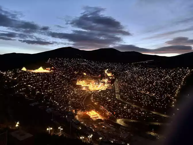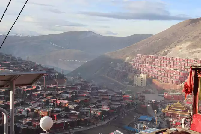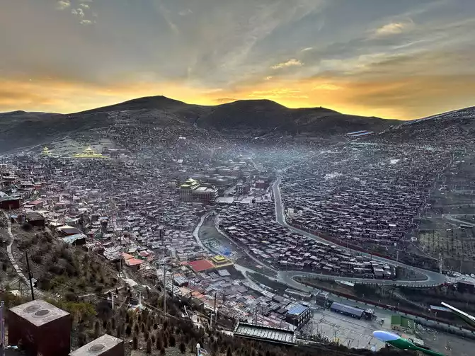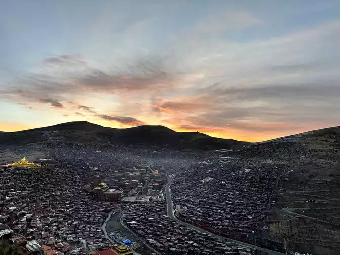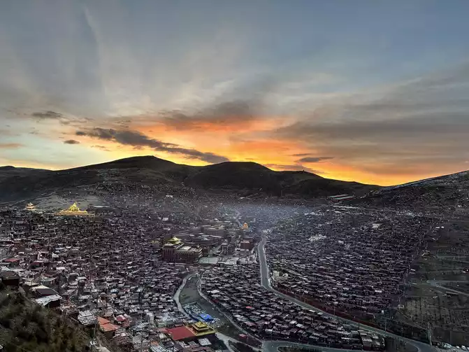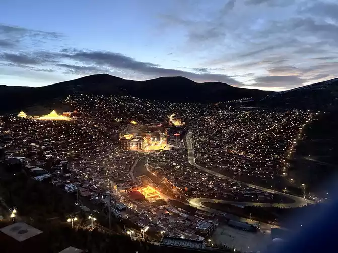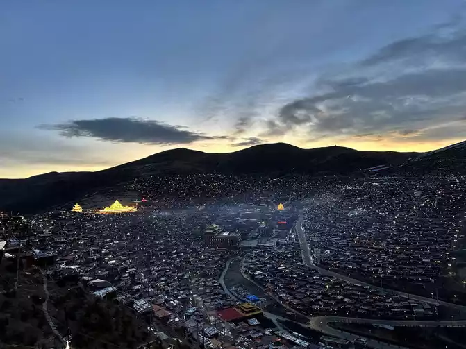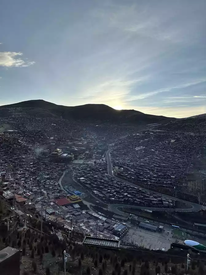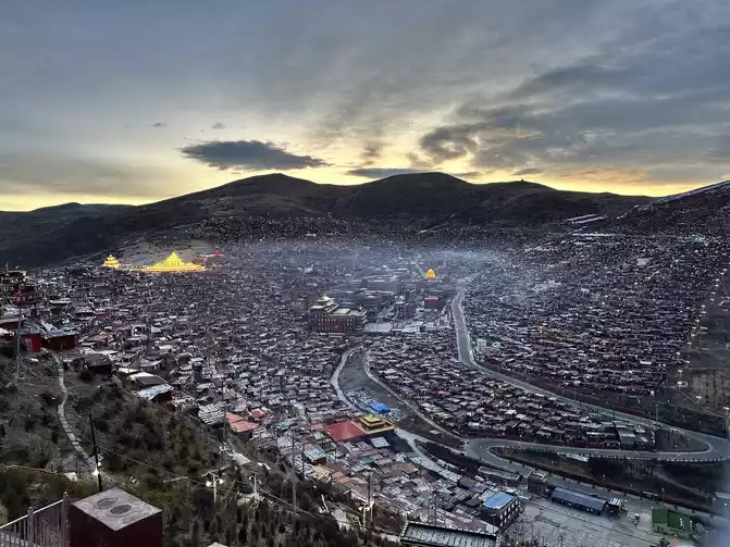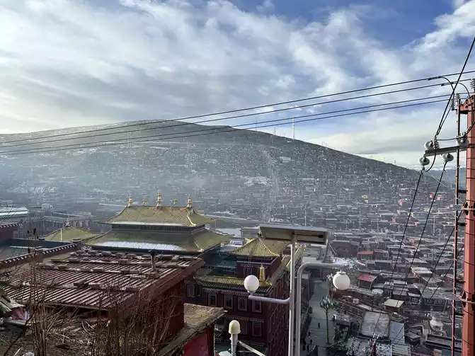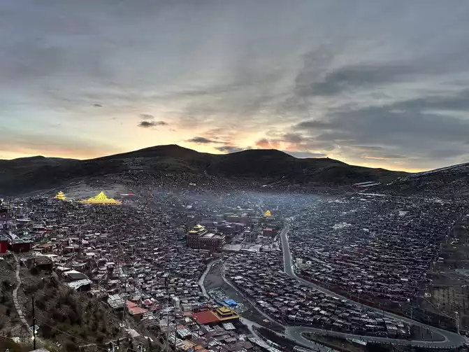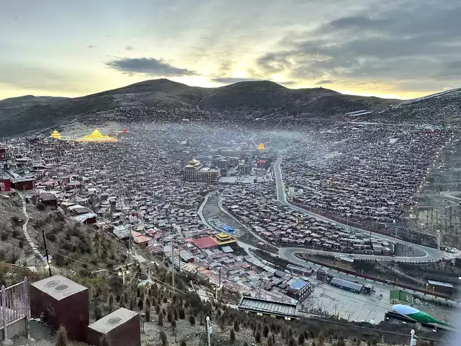 After taking a simple photo, I quickly put on my inner three layers and three outer layers, and then waited for dawn at the observation deck. From six o'clock to eight o'clock, standing on the observation deck, looking down at the panoramic view of the Buddhist Academy, from dark to dawn, it is really no color after Seda, the Buddha country in heaven, the world without the hustle and bustle of the world, it is no longer possible to describe this beauty in words.