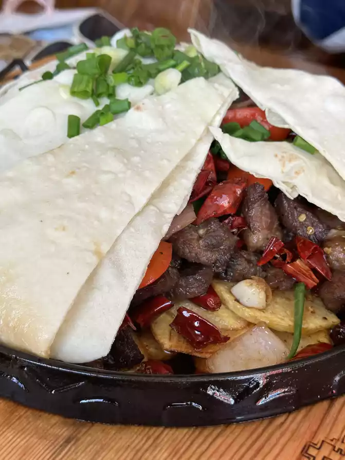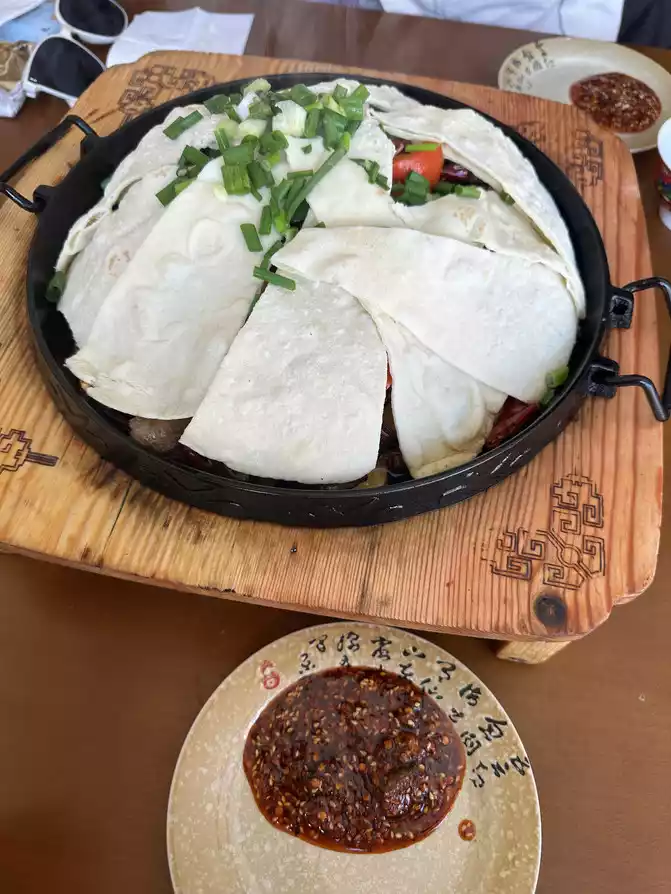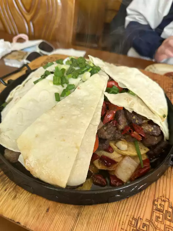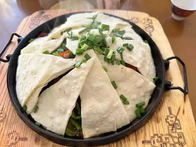 Previously, I also found the No. 1 restaurant in Ganzi County called "Ram Tibetan Meal", according to the navigation in the county seat to stop and take pictures to eat, when I arrived at the store because I avoided the meal, so there was no one, the proprietress lady was very enthusiastic, she ran a small restaurant by herself, ordered a beef lid quilt and a pot of milk tea, I originally wanted to see if I wanted to order anything else, but the proprietress lady was very kind, telling us that two people should eat these should be enough, If you can't eat enough for a while and order something else, you can order these two things first. Once again, I experienced the pure kindness of the Tibetan people. The beef cover is indeed very large after it is served, the beef is very tender, the potato slices are stir-fried with oil and dipped in chili peppers, very fragrant and fragrant, the cover should be pancakes made of highland barley noodles, very crispy and fragrant, and I am so satisfied to eat. After eating, I chatted with the proprietress for a while, and the young lady also introduced the surrounding attractions, as well as the local customs, and agreed with the young lady to bring her beloved to Ganzi to play in the future hehe, and finally returned to the hotel, the young lady also reminded us two little girls to pay attention to safety on the way back, very kind proprietress Oh, when I have the opportunity to go to Ganzi again, I will go to eat Ram Tibetan food.
