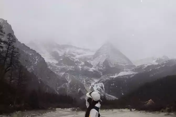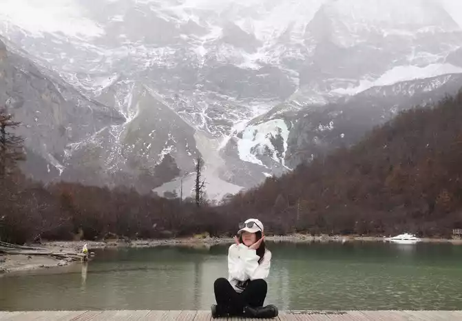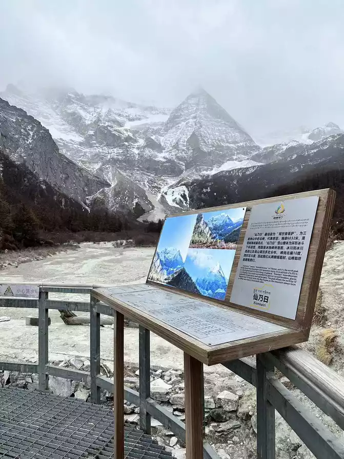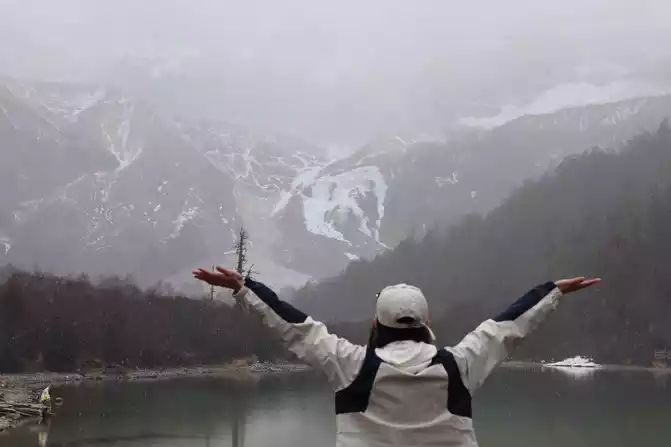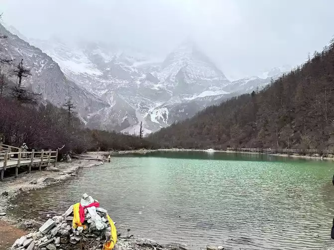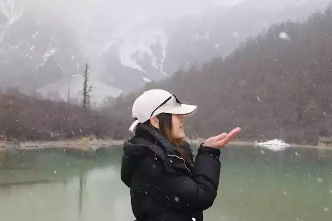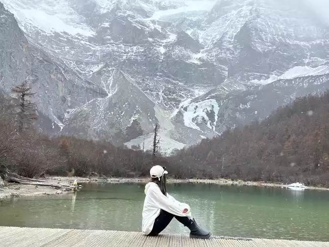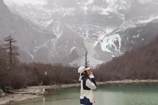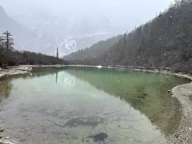 After walking through the world's longest 800 meters (hey, the navigation shows that the distance from Chongguji Temple to the Pearl Sea is only 800 meters), it took an hour and a half to walk to the first Xiannai Sun viewing point and the Pearl Sea, but when I saw the Pearl Sea and Xiannai Rijin Mountain, I felt that I was tired, because it was snowing, and the turquoise Pearl Sea plus the white snow-capped mountains with falling snow was really beautiful. It was not cold in an instant, and I started taking pictures directly.