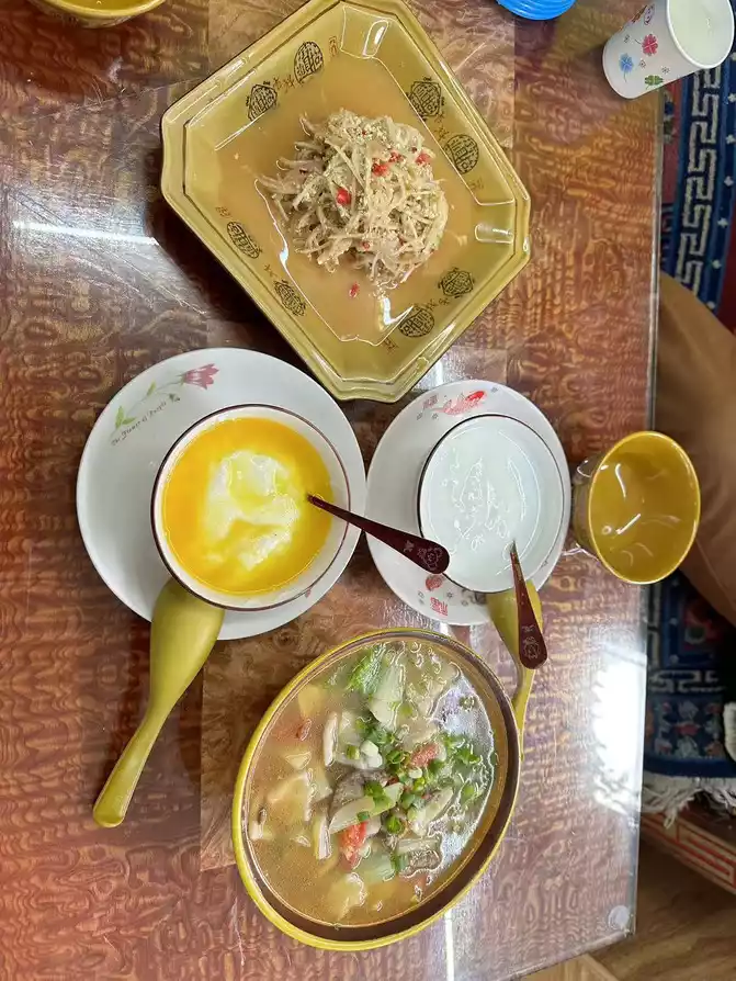 Today, I changed the powder to noodles, asked for a tea egg, a meat bun, some fruit side dishes and milk, and a standard tsampa hehe...
