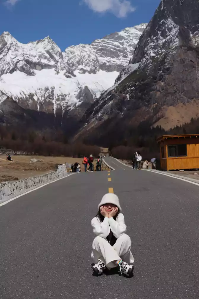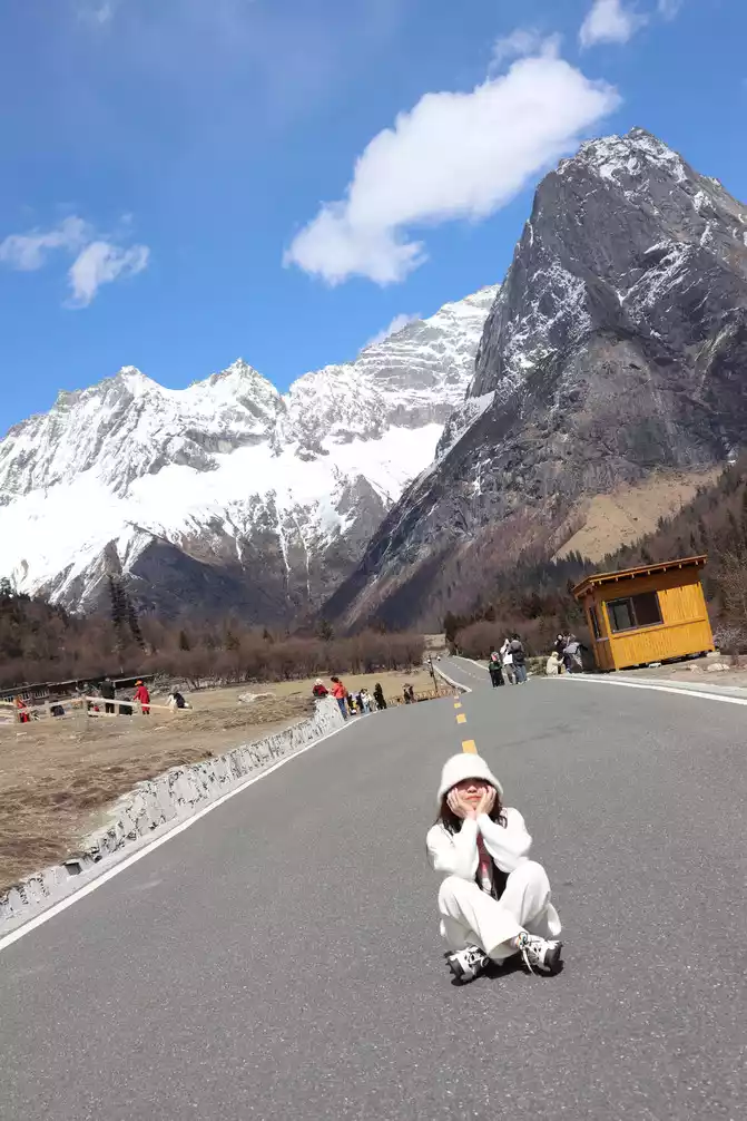 second stop of Shuangqiaogou is Potala Peak, named because the peak resembles the Potala Palace, where the blue sky and white clouds, the wide road and Potala Peak, a beautiful scene... The beauty giggles.
