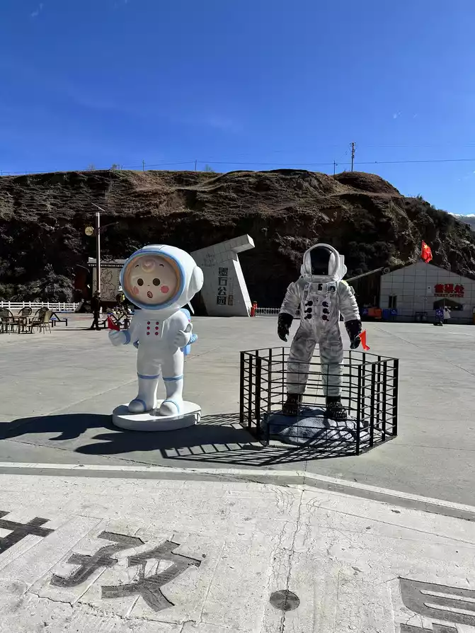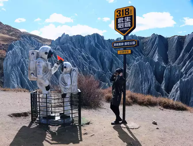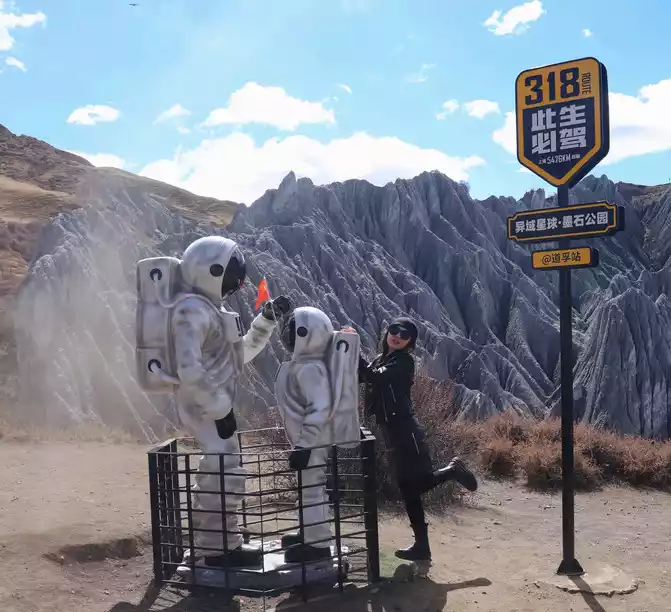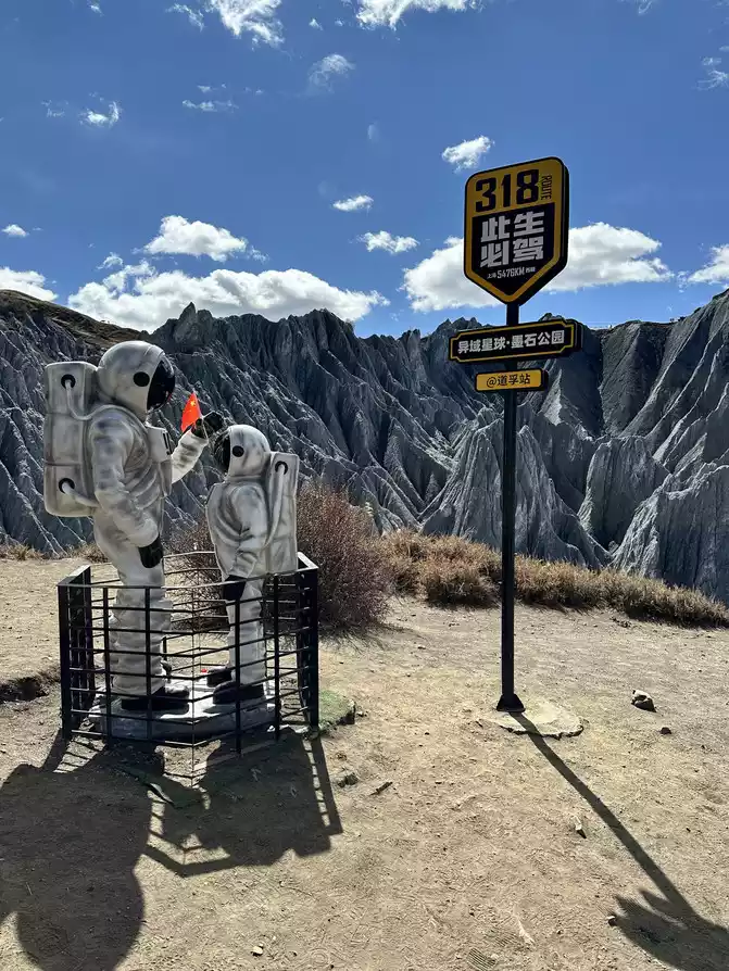 Walk all the way along the plank road, and after going downhill, you can see the check-in point of the 318 that must be driven in this life, there are model characters of astronauts, and it is also a super movie position.