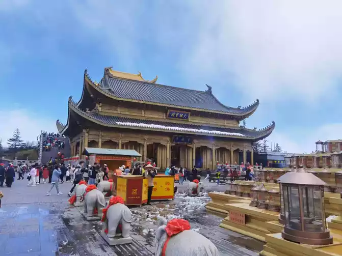 The golden peak of Mount Emei in March in Yangchun had just snowed the day before, wrapped in silver, a little more solemn and beautiful, looking up, a wisp of golden light pierced into the eyes, That is the four-sided statue of the universal sage, and the white snow reflects the sun and a little red, which makes people feel refreshed and refreshed.Ten minutes on foot, we arrived at the Golden Peak Scenic Area of Mount Emei, the four directions of the golden dome are shining with golden light, everyone admires them, and we are also catching up with the few sunny days of the year on the top of the mountain, and we feel that the Buddha's light is shining and golden!