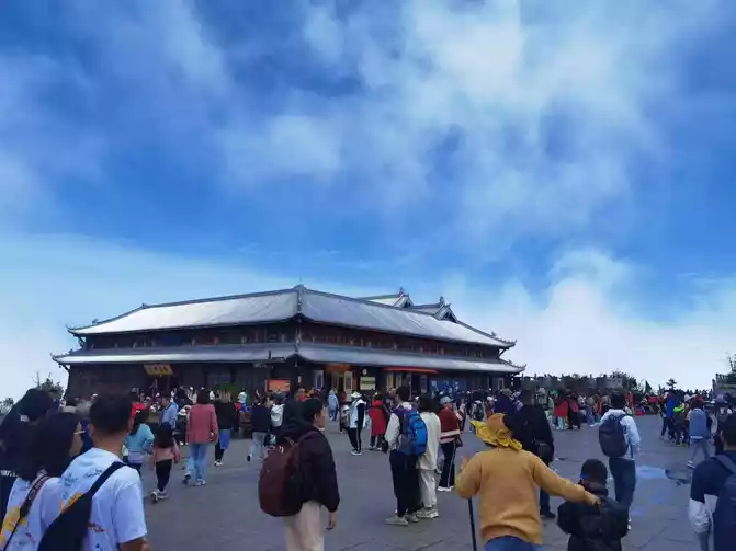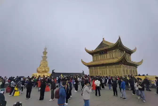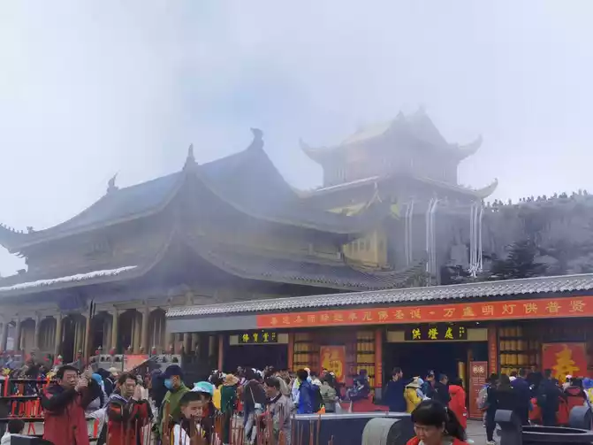 Under the guidance of the tour guide, we burned incense and worshipped in front of the Puxian Statue, the Daxiong Treasure Hall and the Guanyin Hall respectively, and lit two candles before each worship, and then used the candles to ignite three pillars of incense. Although I do not believe in Buddhism, I am still impressed by the boiling incense and pious etiquette, and pray for the safety of my relatives and the prosperity of my family and country. And just as we were about to climb to the top after worshiping, the entire golden dome was once again shrouded in clouds and mist, and the cliffs were full of thick fog everywhere, and the scenery below the mountain was hidden in the clouds.