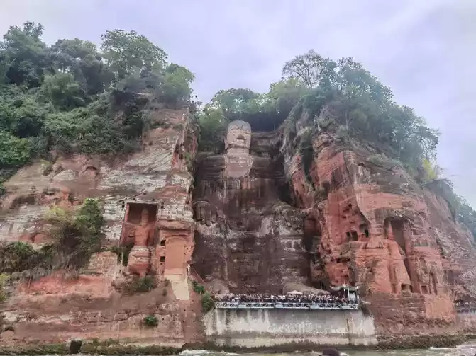 At 10:50, we arrived at the Leshan Giant Buddha Scenic Area, at this time the parking space was full, and the road directly to the scenic spot was also restricted, we stopped the car under the guidance of the scenic spot staff, and then walked to the Leshan Giant Buddha boat boarding. The Leshan Giant Buddha is located on the side of Lingyun Temple on the east bank of the South Min River in Leshan City, Sichuan Province, at the confluence of the Dadu River, the Qingyi River and the Min River. The Big Buddha is a seated statue of Maitreya Buddha, 71 meters high, and is the largest cliff carving statue in China.There are two ways to visit the Leshan Giant Buddha, one is to walk up the mountain and take the "Nine Bends Plank Road" to see the Buddha up close, but it is difficult to see the whole picture of the Buddha because "only because you are in this mountain"; We chose the second way to travel by boat. After queuing for about half an hour, we finally arrived at the pier, but unexpectedly we were blocked, and we were one short of being able to get on a boat. And unexpectedly, the next boat is the best and latest cruise ship in the scenic spot, and because we were the first to get on the boat, we chose the position closest to the side of the ship on the second floor and sat down, and the front of the ship was vast. Therefore, when you go out, you must be calm and have Buddha in your heart, as long as you have a good mood, the scenery will be good all the way.