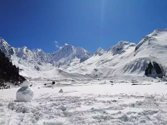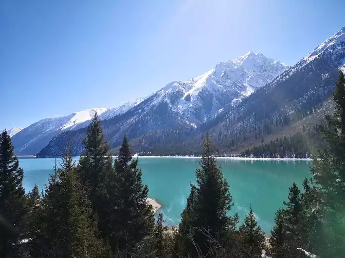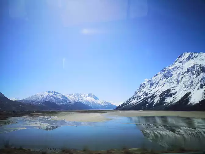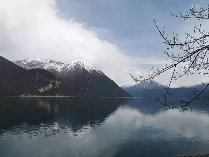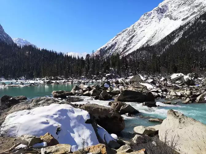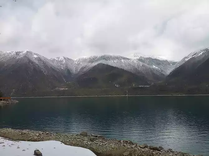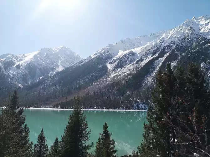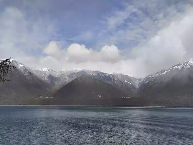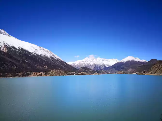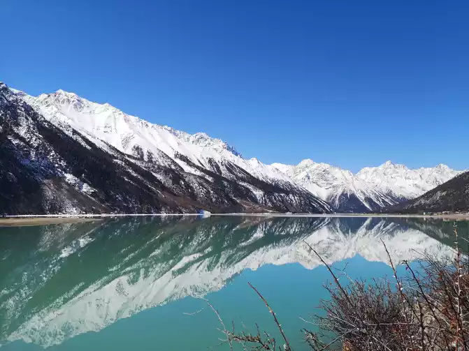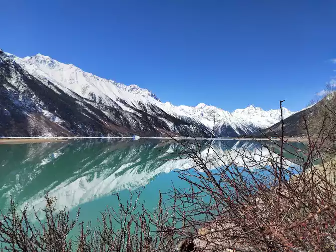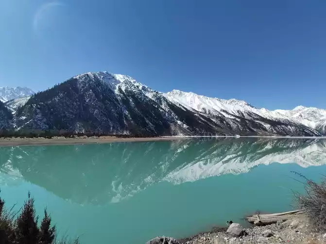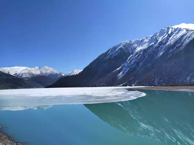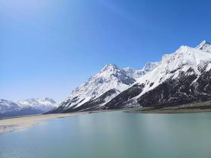 The water of Basuncuo Lake is crystal clear, and the surrounding snow-capped mountains are reflected in it. The sun came out at noon, the sun shone on the snow-capped mountains, and the white snow shone in the sun.