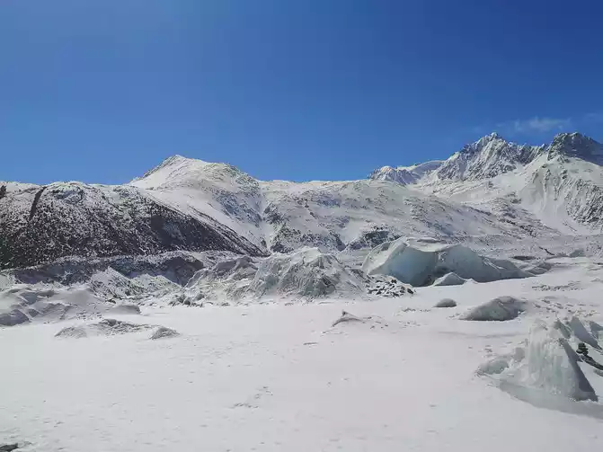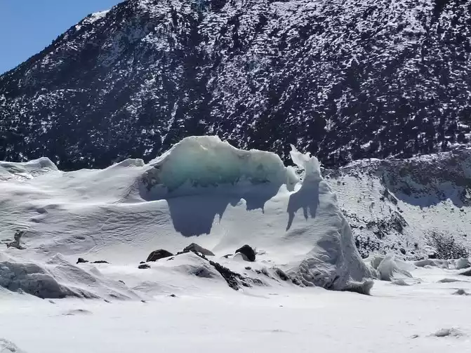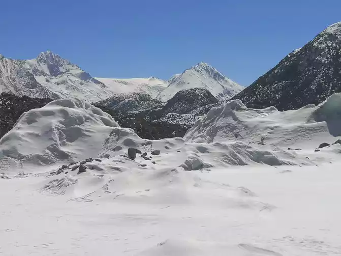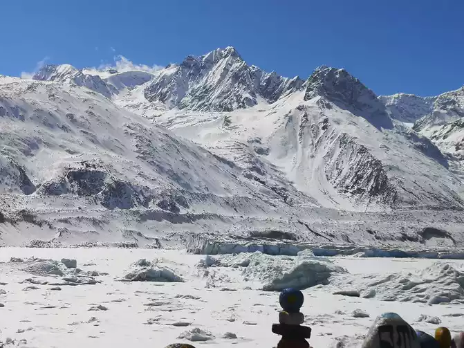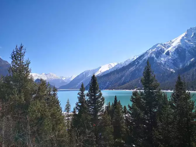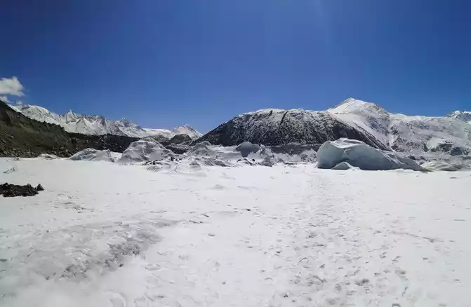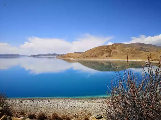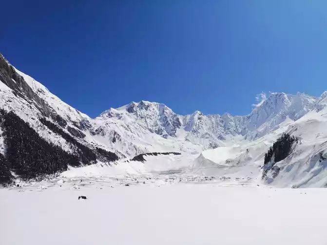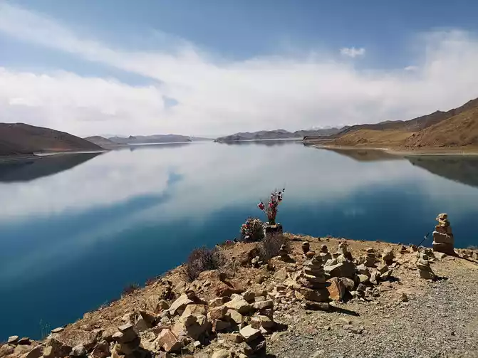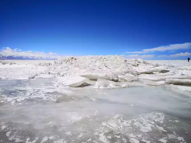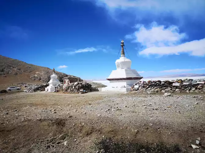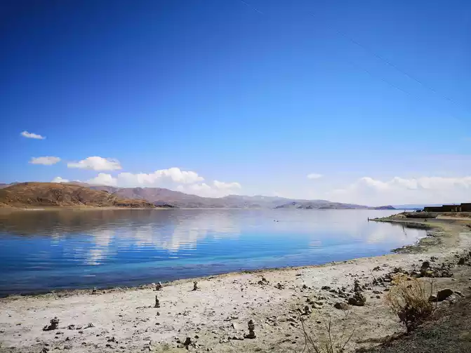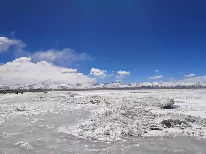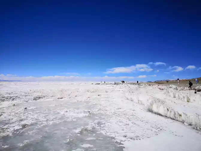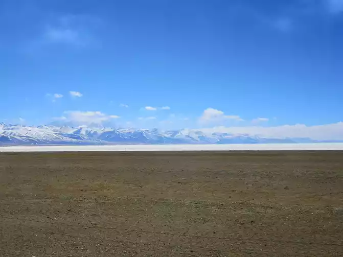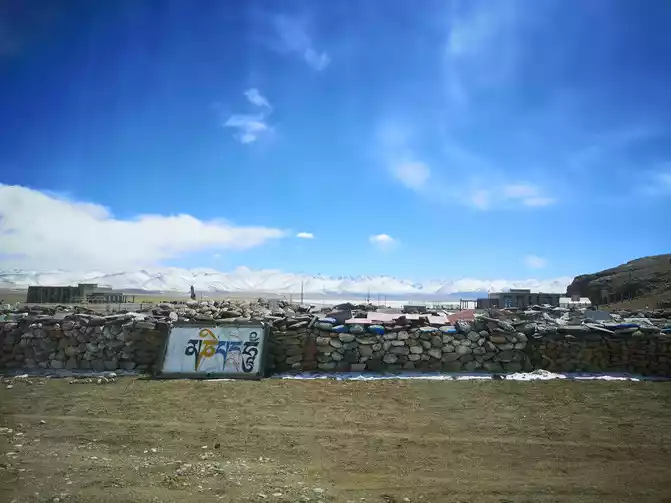 At the foot of the lake, there are many mani piles piled with stones. It was March, and the ice and snow on the lake had not yet melted, and when I looked up, the deep and sparse blue sky above my head was integrated with the frozen lake; The majestic snow peaks in the distance are like jade towers and jade palaces, appearing and disappearing.