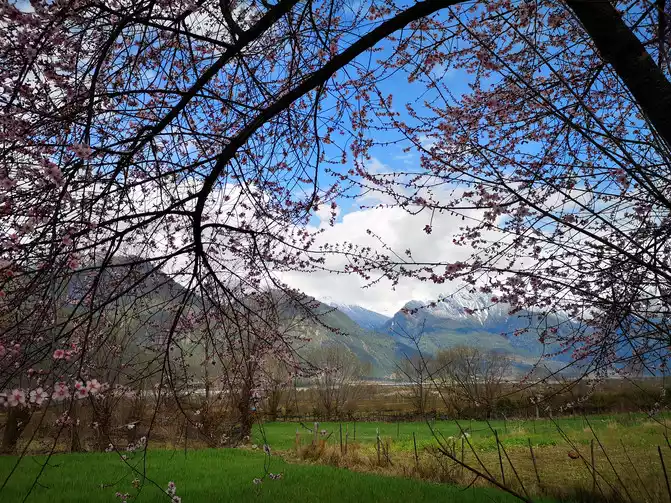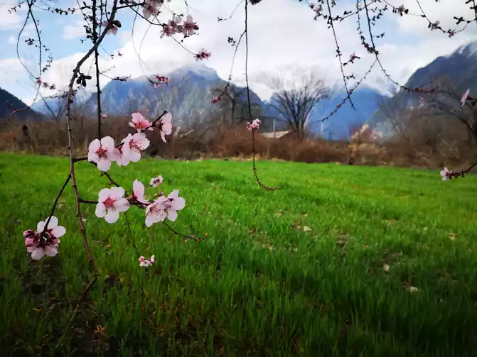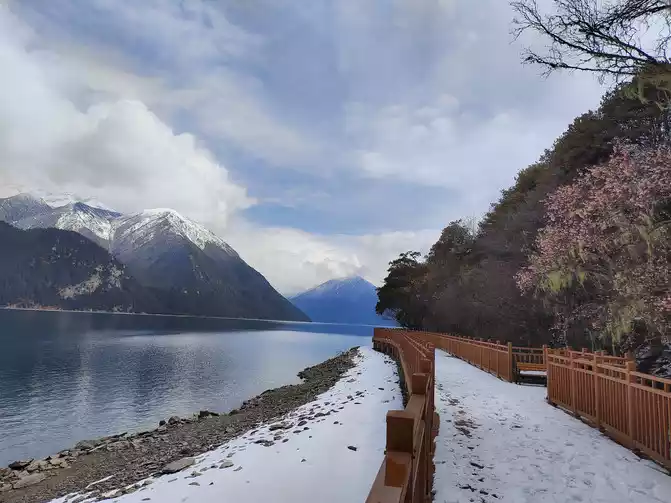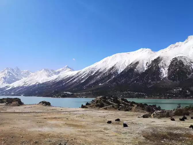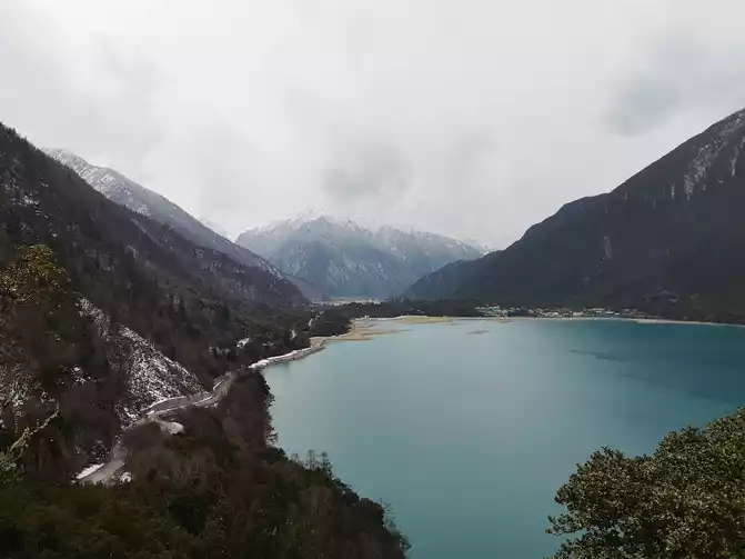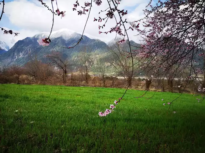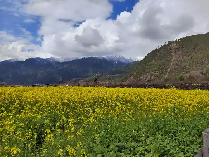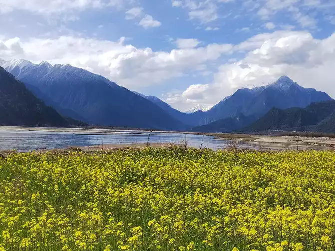 continues along Yigong Lake, there are many farmhouses by the lake, patches of blooming rapeseed flower fields and sporadic peach blossoms, in the snow-capped mountains, It is particularly beautiful against the backdrop of the lake.