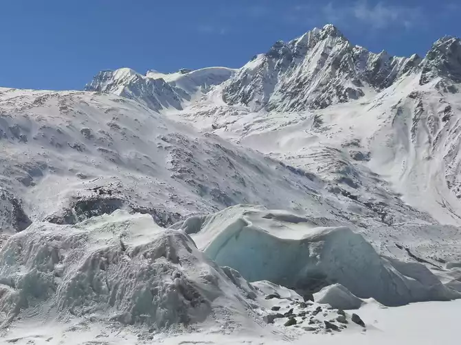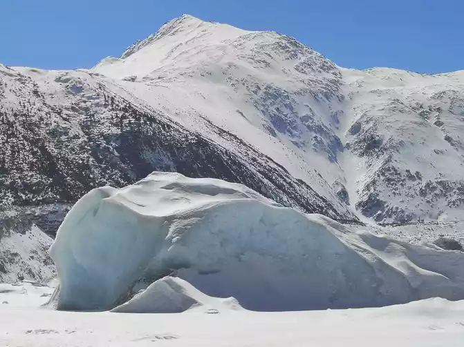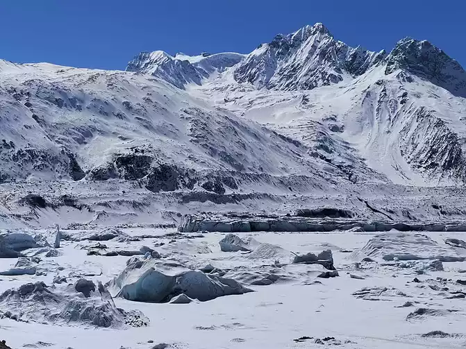 Galongla Snow Mountain is located at the junction of Motuo County and Bomi County in the Nyingchi Region of the Tibet Autonomous Region, is the western end of the Gangrigab Mountains (also the northwest extreme of the Hengduan Mountains), with an average altitude of 4,800 meters and an altitude of about 4,200 meters above sea level. The top of the mountain is covered with ice and snow all year round, and the mountain is home to several glaciers, with typical modern glacial landforms, and the glacial meltwater eventually flows into the tributaries of the Brahmaputra River.