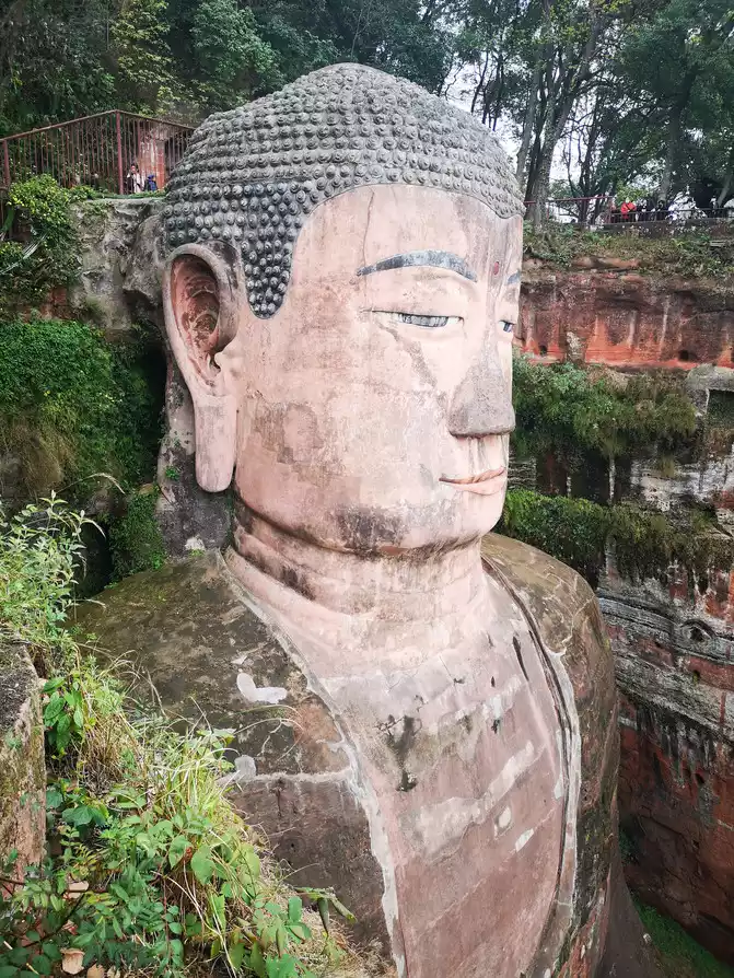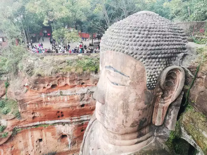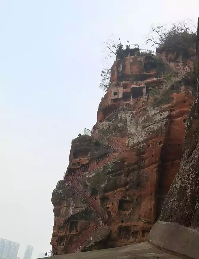 On the left side of the Giant Buddha, going down the "cave sky" is the beginning of the Lingyun Plank Road, and on the right side is the Jiuqu Plank Road. When we went, the Jiuqu Plank Road was not open, and we could reach the bottom of the Big Buddha by going down the Lingyun Plank Road.