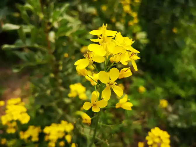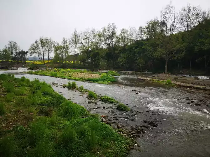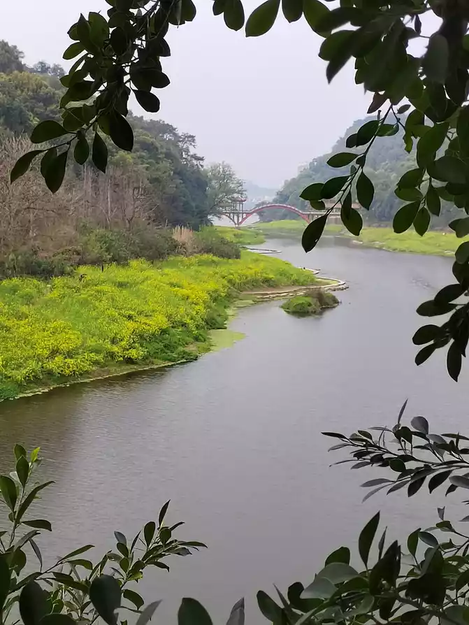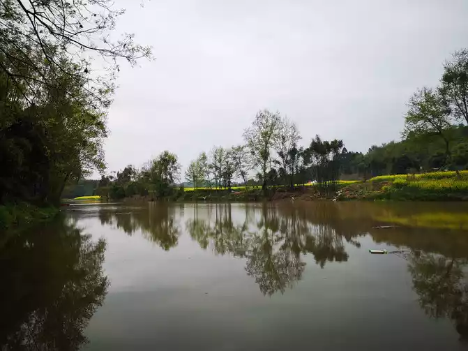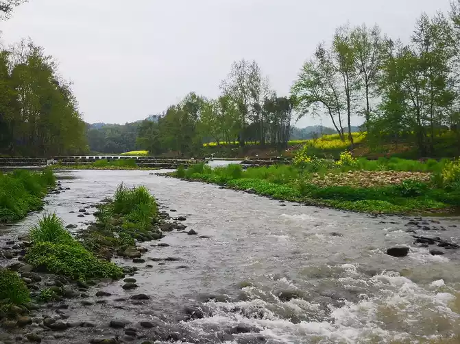 Down from the mountain, there is a large rapeseed flower field by the small river. The humid air rushes in front of you, and the blooming rape flowers are reflected in the water, and the gurgling water forms a tranquil pastoral beauty.