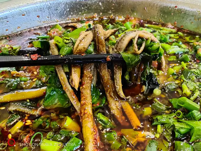 In addition, the Linjiang eel silk trip to Leshan, which local friends have been through many times, has finally been arranged as desired. Located in Linjiang Town, not far from the suburbs of Leshan City, in fact, there are also many restaurants that specialize in Linjiang eel shreds, friends focused on recommending Qingli Hotel, 80 catties of eel shreds should be the general price in the town, the method is a bit similar to the flavor of Sichuan cuisine boiled meat slices, the eel is deboned and cooked and the eel roots are flexible and fragrant, and after eating the eel shredded soup base can also be put into the noodles, which is quite amazing and delicious.