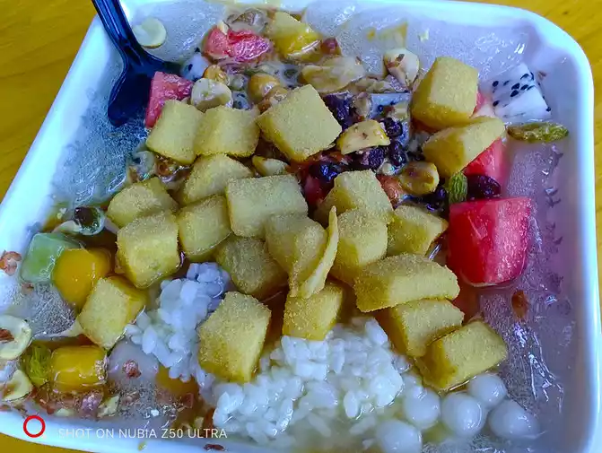 Blindly clicked a signature mother-in-law ice powder, a large bowl full of 10 yuan, in addition to the ice powder, a whole fresh fruit + dried fruit + taro balls + glutinous rice cake and other ingredients, the feeling of stacking materials visible to the naked eye, basically a bowl of ice powder has a slight feeling of satiety, so there is really a sense of regret that the stomach is not enough to play in Leshan.